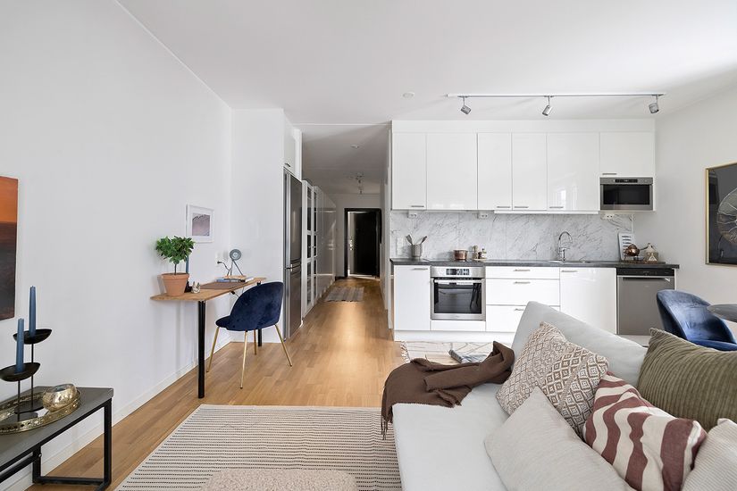 Bostaden har en rymlig hall som välkomnar dig in. Köket är modernt med stilrena skåpluckor i vitt, generösa arbetsytor och plats för matbord. Vardagsrummet är lättmöblerat och har stora fönster som bidrar till en ljus och trivsam miljö. Genomgående parkettgolv ger en enhetlig och ombonad känsla. Badrummet är fullt utrustat med dusch, kommod, golvvärme samt både tvättmaskin och torktumlare för extra bekvämlighet. Sovrummet rymmer en dubbelsäng och övrigt möblemang.