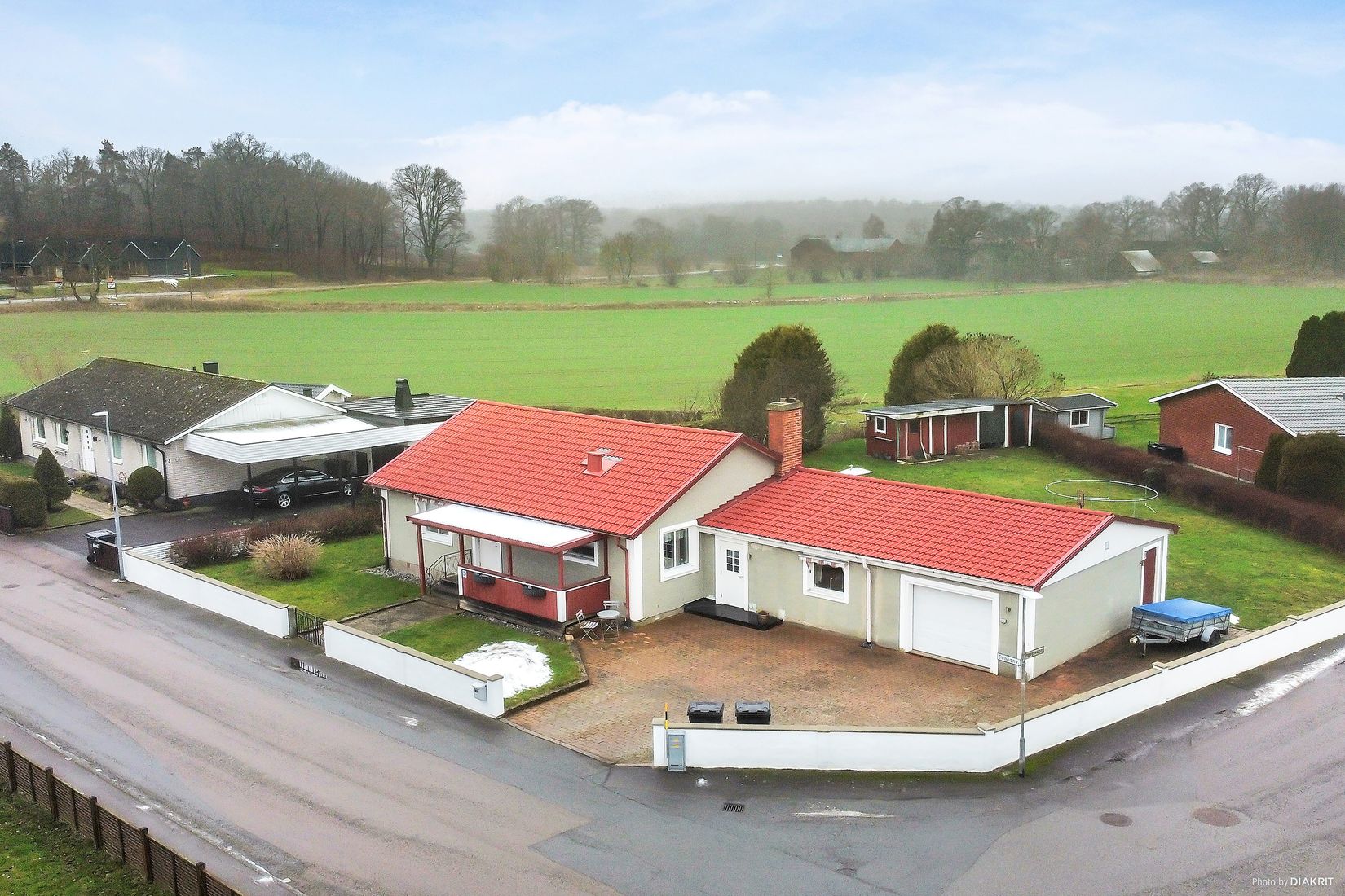 Vidbyggt garage med god arbetsyta och plats för en bil. Luft/vatten värmepump och 2 eldstäder, fiber installerat.