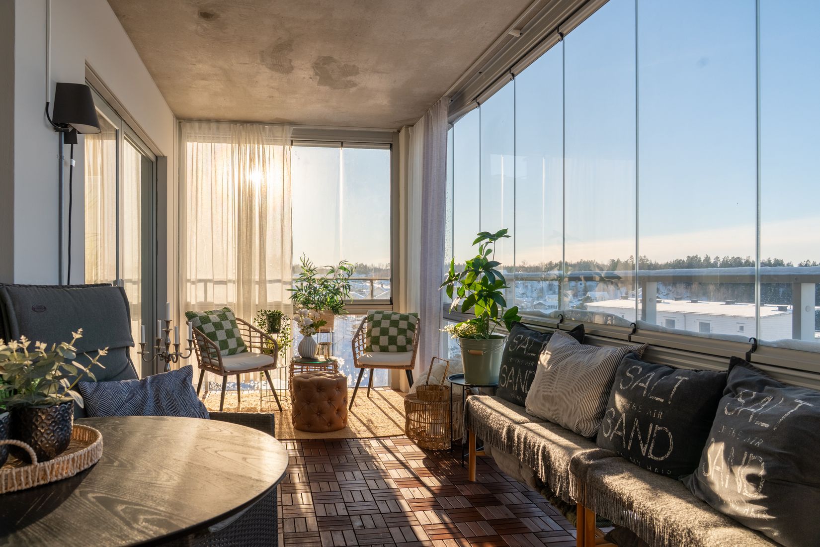Den inglasade balkongen är en av bostadens starkaste tillgångar. Med skjutbara glaspartier och fri vy mot vatten skapas en användbar och trivsam uteplats som kan nyttjas under större delen av året.