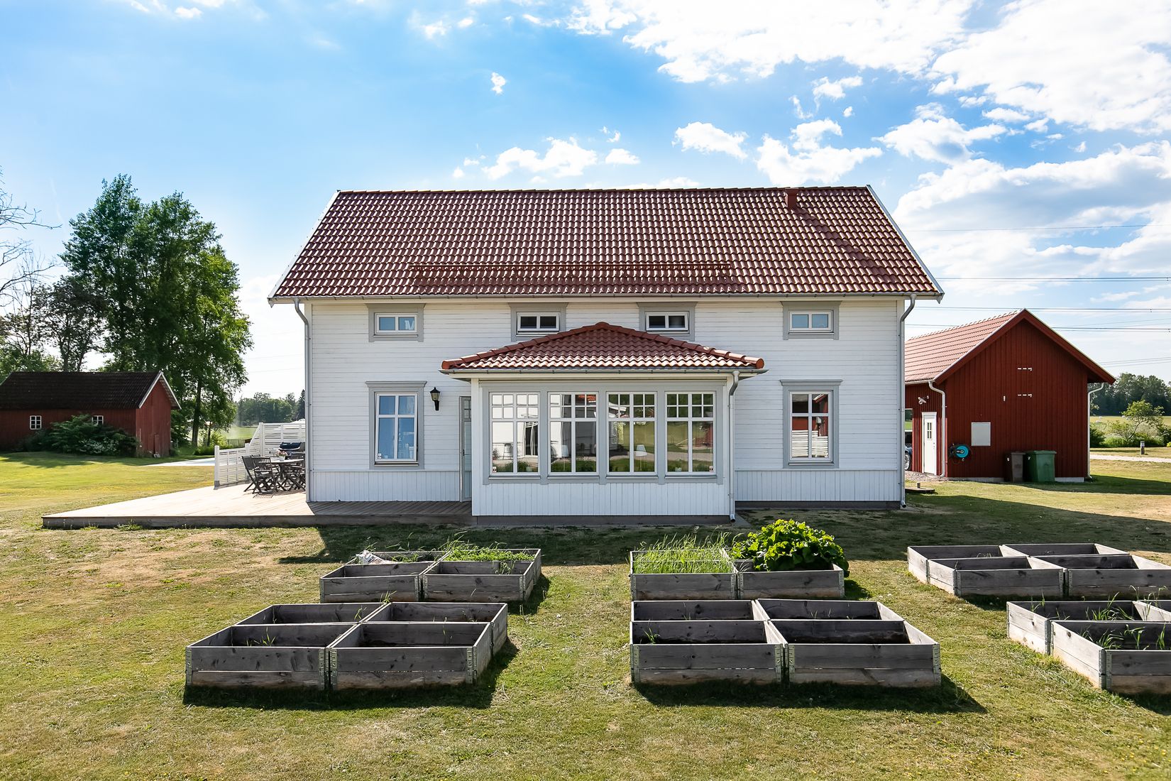 Utemiljön bjuder på det lilla extra – en stor pool med tillhörande trädäck, perfekt för varma sommardagar, samt en rymlig altan i direkt anslutning till huset som förlänger sällskapsytorna utomhus. Den grönskande trädgården erbjuder fina odlingsmöjligheter och gott om plats för lek, avkoppling och framtida projekt.