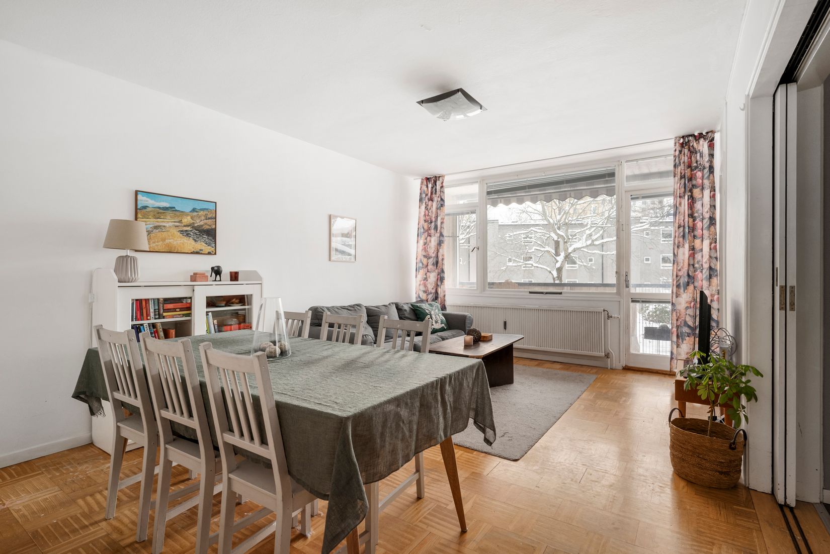 Bostaden erbjuder en genomtänkt planlösning med generösa sällskapsytor där vardagsrum och kök samspelar på ett naturligt sätt. Här finns gott om plats för både vardag och umgänge, med stora fönster som ger ett härligt ljusinsläpp och skapar en luftig känsla.