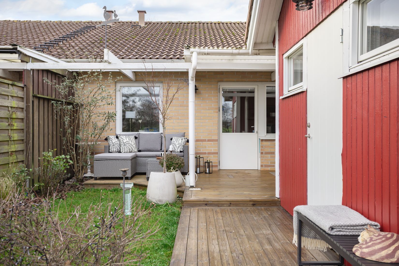 Vardagsrummets generösa sällskapsytor samspelar med matplatsen i en öppen och inbjudande planlösning. Under sommarhalvåret förlängs rummet naturligt ut till den vidbyggda uteplatsen med skyddande skärmtak – en perfekt plats för avkoppling. Här njuter du av utsikten mot Nybroån, med betande rådjur i närheten och ett ständigt ackompanjemang av fågelsång. Även vid entrén i västerläge finns en uteplats med yta för två.