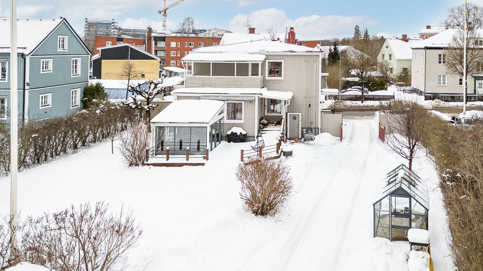 Källaren ger dig gott om förvaringsmöjligheter och inkluderar en praktisk tvättstuga. Den inglasade verandan är isolerad och erbjuder en fri utsikt över den generösa och lummiga tomten om 1343 kvadratmeter. Här kan du njuta av solens strålar på den trevliga uteplatsen, som bjuder på många soltimmar.