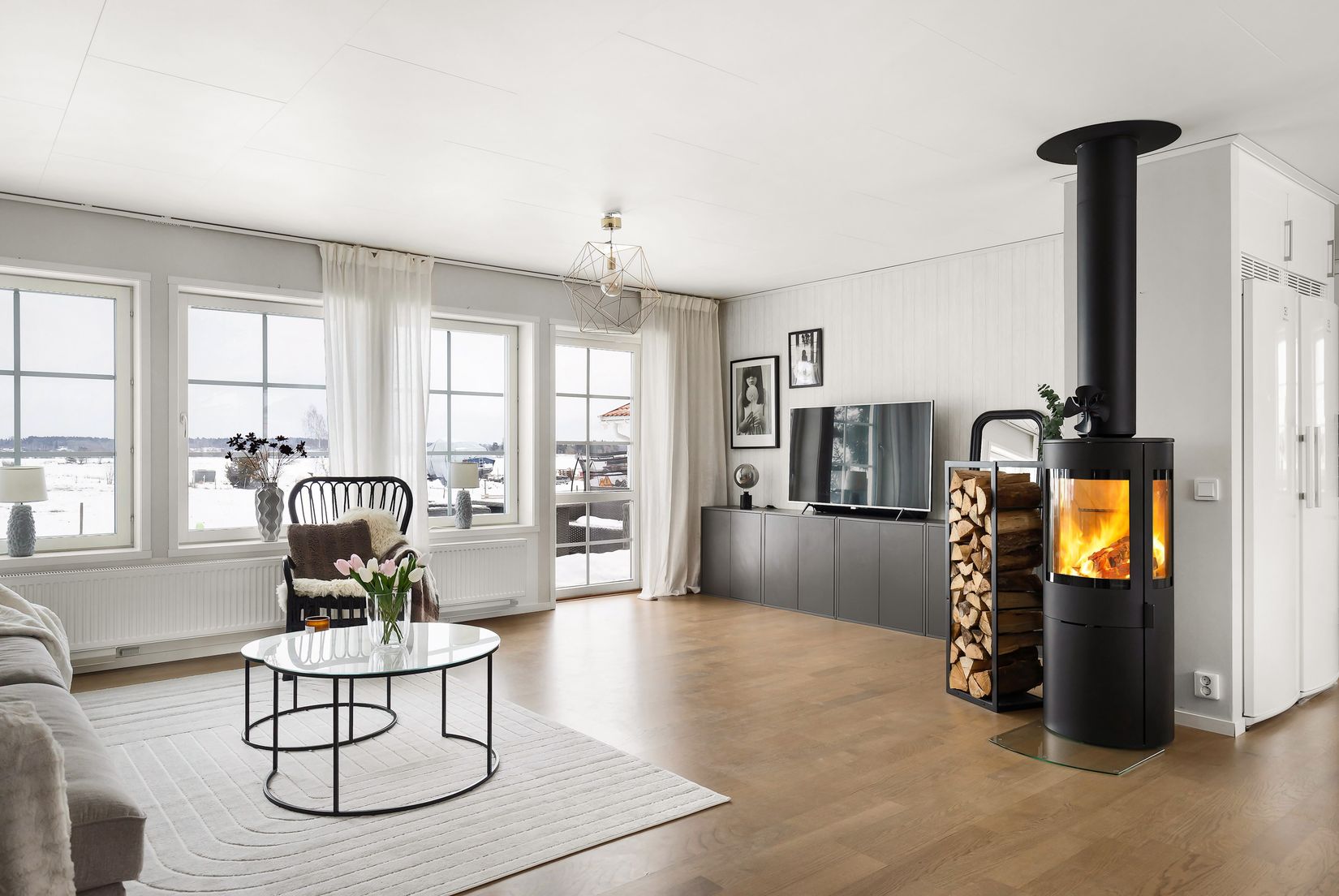 Bostaden omfattar fem rum och kök och erbjuder en öppen planlösning mellan kök och vardagsrum med generösa sällskapsytor och ett trevligt ljusinsläpp från flertalet fönster. Här finns även en braskamin som bidrar till både komfort och trivsel. Från vardagsrummet nås den stora altanen som löper längs med husets ena långsida, här kan ni sommartid njuta av solen och den rogivande vyn över ängar med betande kor.