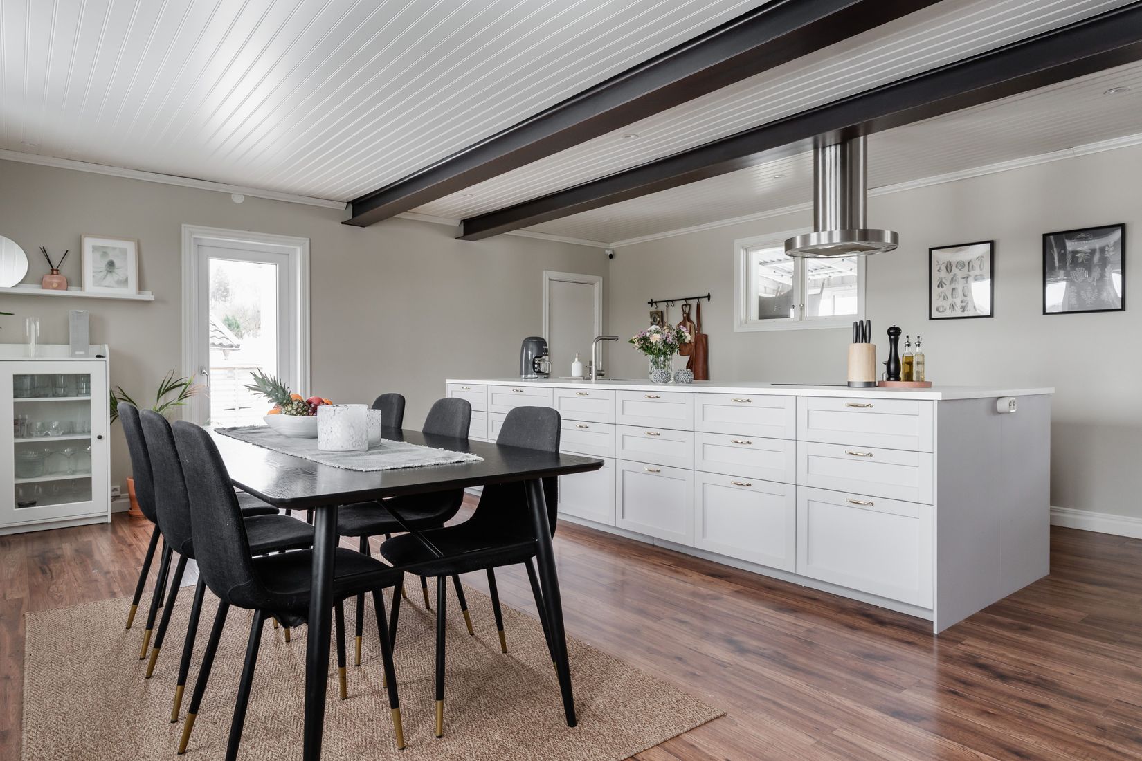 Redan i hallen möts du av ett mycket välkomnande intryck. Det stilrena klinkergolvet är både praktiskt och elegant, och här finns gott om plats för avhängning. Direkt till vänster leder trappan upp till ovanvåningen, men vi börjar med att utforska entréplanet. Till höger öppnar bostaden upp sig i ett ljuvligt vardagsrum och kök i öppen planlösning – ett socialt och genomtänkt hjärta i huset. Här flödar ljuset generöst och blicken dras naturligt mot den magiska utsikten över Sämsjön, som skapar en känsla av lugn och exklusivitet året om. En plats som bjuder in till både vardagsliv och minnesvärda middagar med familj och vänner. Vidare in på entréplanet finns en praktisk tvättstuga med mycket goda förvaringsmöjligheter – välordnad och funktionell, precis som resten av huset. Rakt fram nås ett nyligen renoverat badrum med moderna materialval och en fräsch, tidlös känsla. Här finns även ytterligare ett vardagsrum som ger flexibilitet i planlösningen, perfekt som TV-rum, bibliotek eller arbetsrum, samt ett harmoniskt sovrum som erbjuder en rofylld plats för vila.