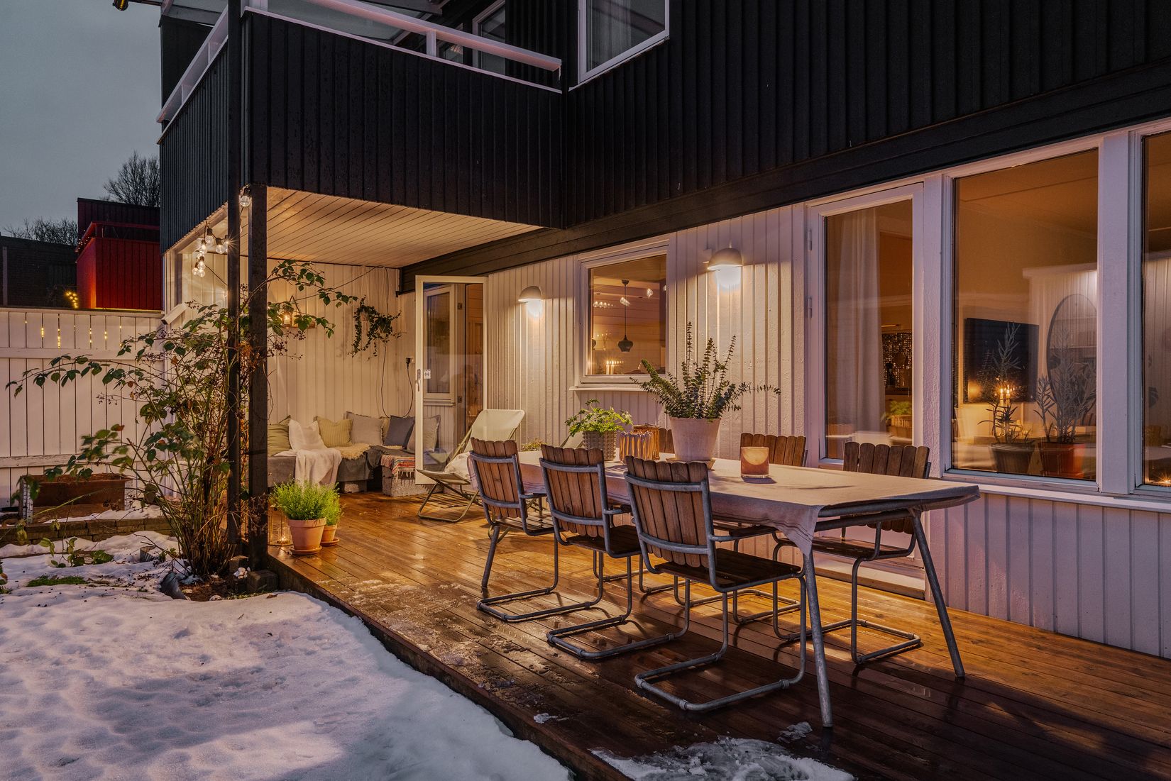 Radhus med gavelläge i väster, insynsskyddad solfylld altan och balkong, topprenoverat badrum, vardagsrum med braskamin, fyra sovrum, garageplats i länga och promenadavstånd till havet. Entréplan erbjuder sociala ytor för samvaro och matlagning och på övre plan ligger fyra välplanerade sovrum samt allrum och badrum. Mycket trivsamt kök med släta vita luckor, fullstor kyl och frys, goda arbetsytor och en diskmaskin som underlättar vardagen. Helkaklat, modernt, badrum med lyxig hotellkänsla, golvvärme samt både dusch och badkar och på entréplan ligger ett gäst-wc.
