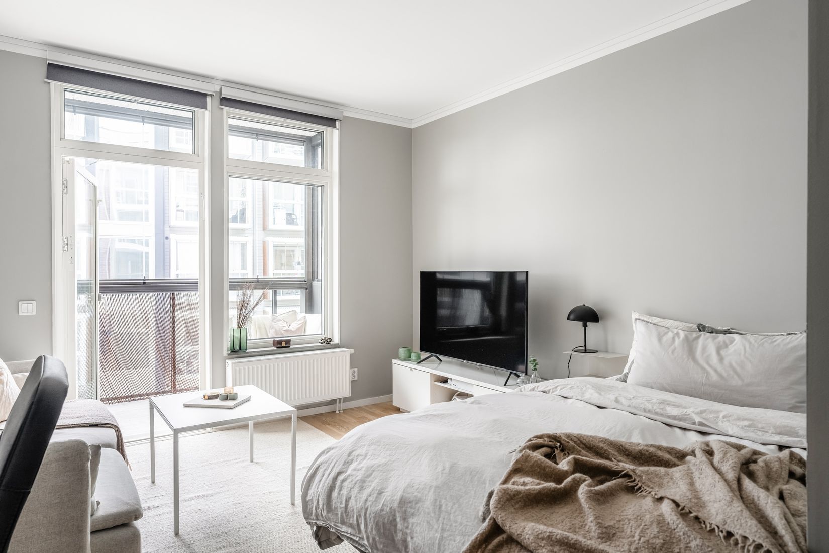 Kök och allrum ligger i öppen planlösning, vilket ger ett fint flöde och sociala ytor. Från allrummet nås den mysiga inglasade balkongen med plats för mindre utemöbler,cen perfekt förlängning av bostaden större delen av året. Allrummet är lättmöblerat och rymmer både säng, soffgrupp och ett mindre matbord för trevliga middagar.