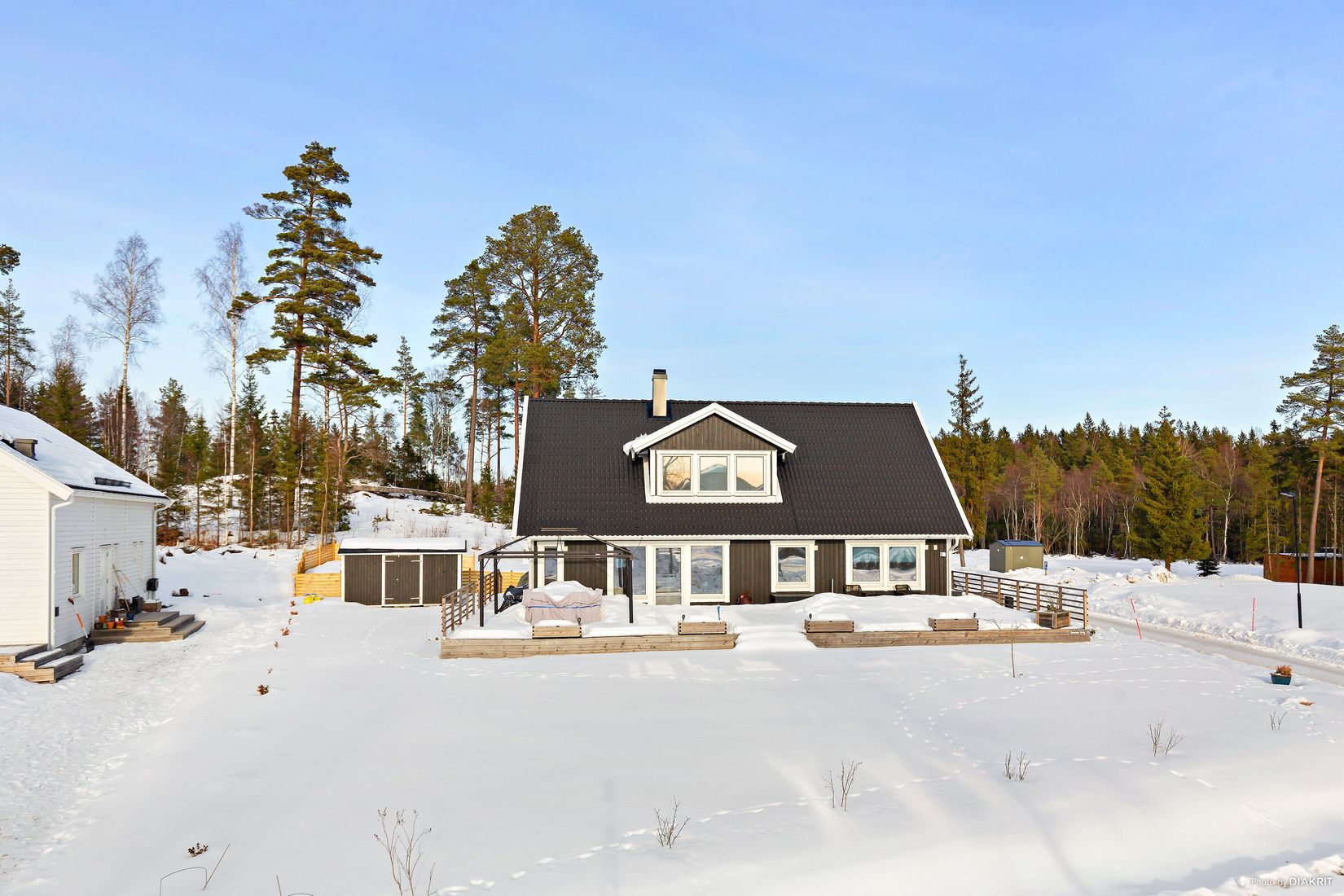 Utomhus väntar en generös träaltan som löper runt huset och erbjuder flera härliga uteplatser i olika väderstreck. Här njuter du av soliga dagar, grillkvällar och långa middagar under bar himmel. Den stora, plana gräsmattan ger gott om utrymme för lek, odling eller framtida pooldrömmar. På tomten har ett förråd byggts samt väl tilltagen parkeringplats med laddstolpe för bilar samt plats för cyklar.