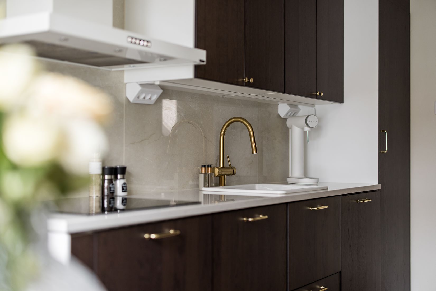 Köket är en tydlig samlingspunkt i bostaden och håller genomgående mycket hög standard. Mörka, eleganta skåpsluckor kombineras med påkostade materialval, stilrena beslag och generösa arbetsytor. Här finns gott om förvaring och en naturlig matplats vid fönster, vilket tillsammans ger ett kök som är lika funktionellt som estetiskt tilltalande.