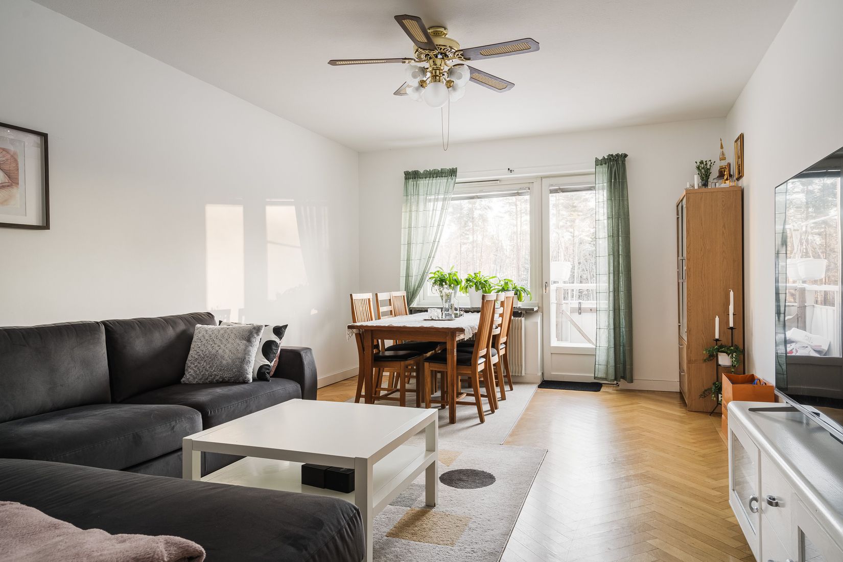 Ett väl tilltaget vardagsrum som får plats med både en matgrupp, soffgrupp och övriga vardagsrumsmöbler utan problem. Parkettgolv och tapetserade väggar. Här finner man utgången till den härliga balkongen!