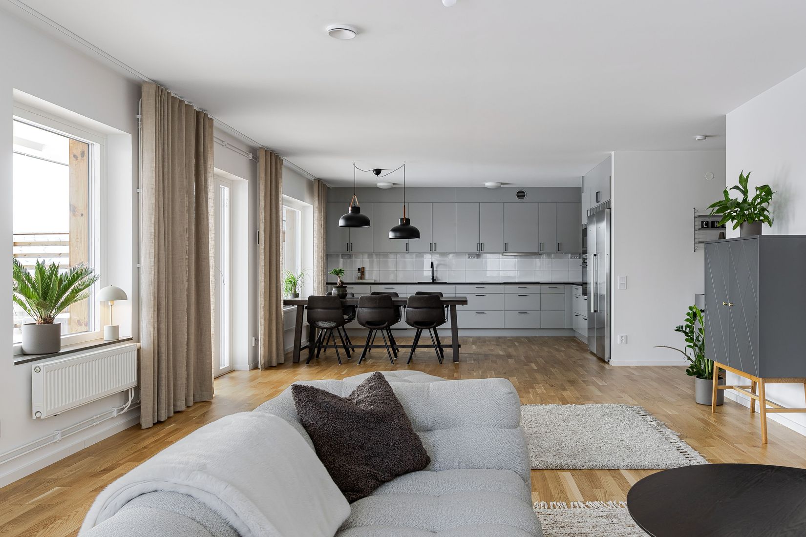 Bostadens hjärta är det eleganta köket från Vedum, som tillsammans med vardagsrummet skapar en öppen och social yta om ca 54 kvm- perfekt för både vardag och umgänge. De stora ytorna ger ett härligt ljusflöde och en naturlig plats för både matbord och soffgrupp.