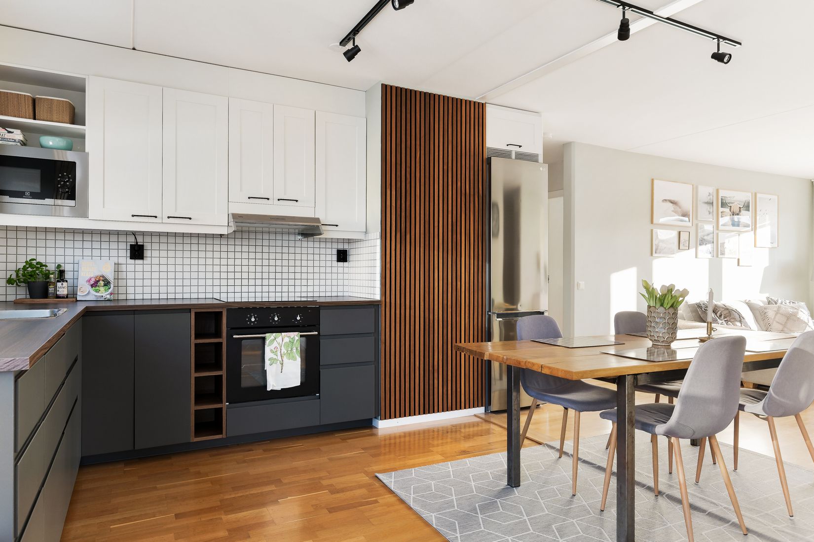 Det ljusa och fullt utrustade köket har gott om förvaringsutrymme och rymmer en matplats för sex personer – perfekt för både vardagsmiddagar och festligare tillfällen.