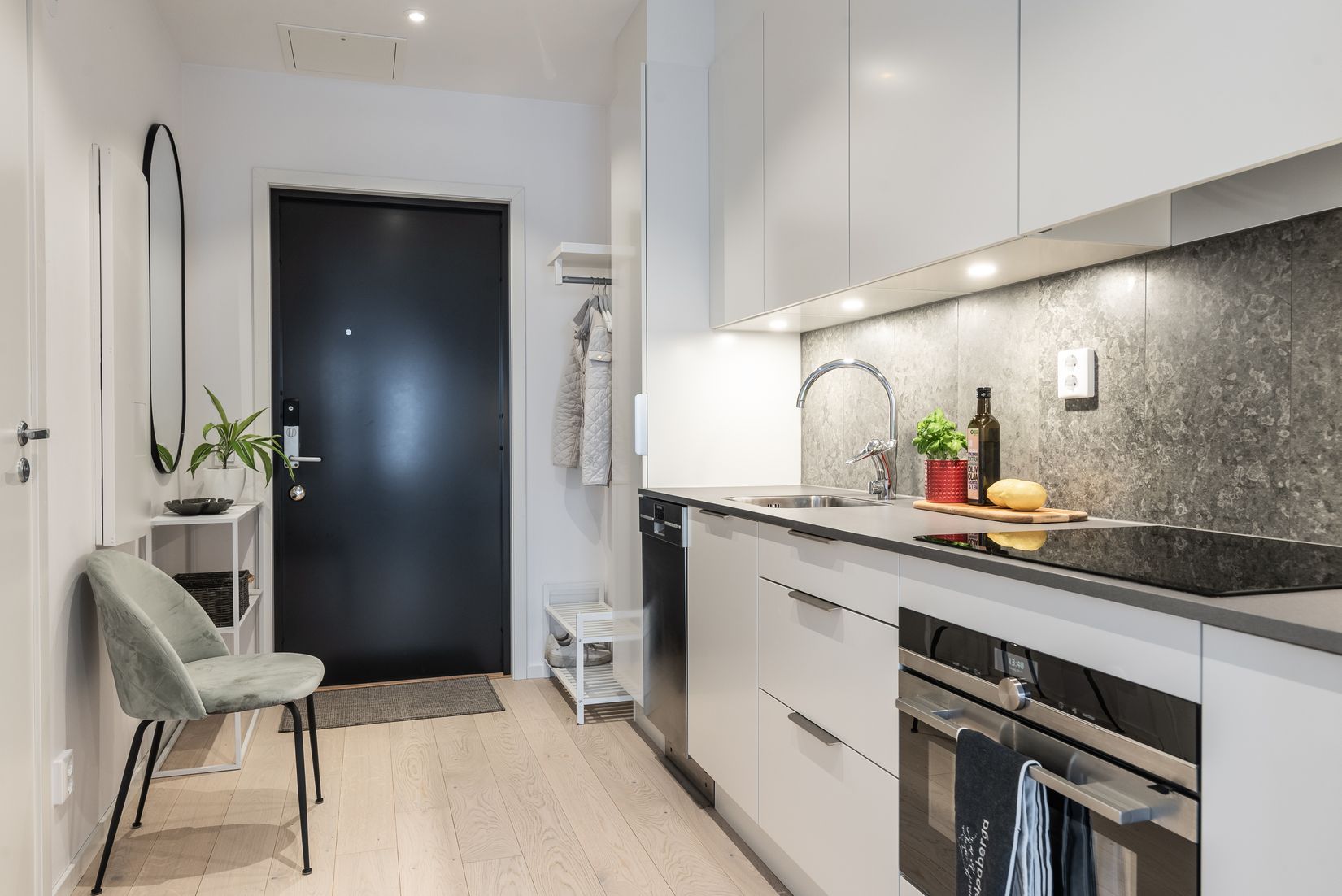 Lägenheten har genomgående ljus parkett, spotlights i taket i stora delar av lägenheten, kök från HTH med vit inredning, stänkskydd i grå granitkeramik och rostfria vitvaror från Siemens. Det eleganta badrummet med dusch går i grå ton med golv och väggar i granitkeramik. Här finns även golvvärme för extra komfort.