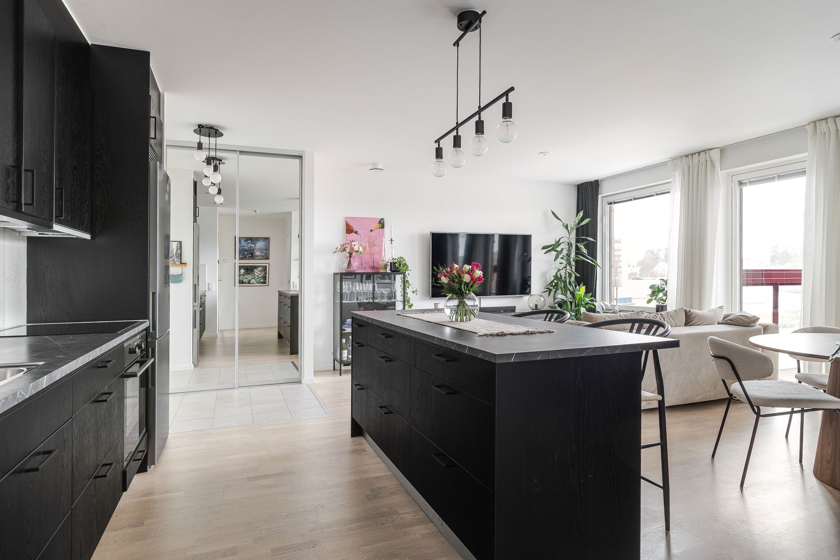 Den öppna planlösningen mellan kök och vardagsrum skapar en fantastisk rymd och en social atmosfär. Härifrån nås den inglasade balkongen i österläge - en perfekt plats att njuta av morgonsolen. Genomgående i bostaden finns snygg parkett som harmonierar fint med de målade väggarna.