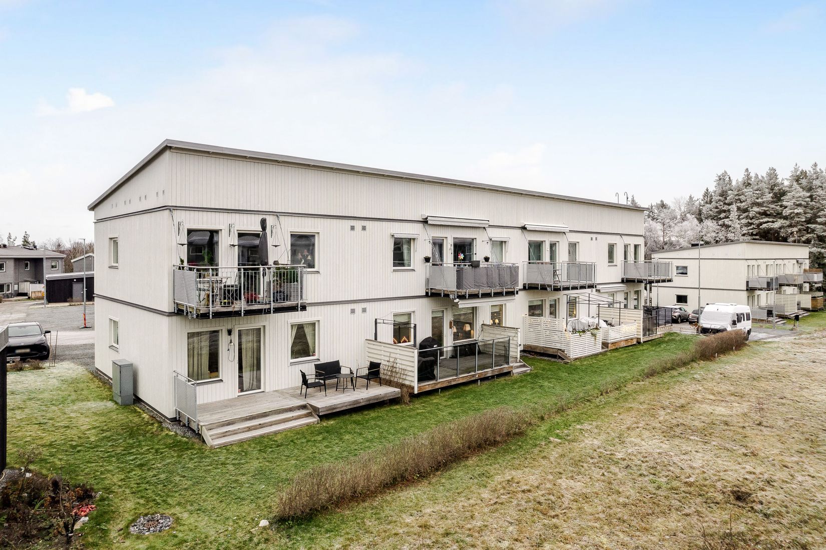 Bostaden erbjuder ett ljust och luftigt vardagsrum med direkt utgång till uteplatsen som blir en naturlig förlängning av hemmet under årets varmare månader. Här finns gott om plats för både loungemöbler och matgrupp, samt gräsyta för odling eller lek.