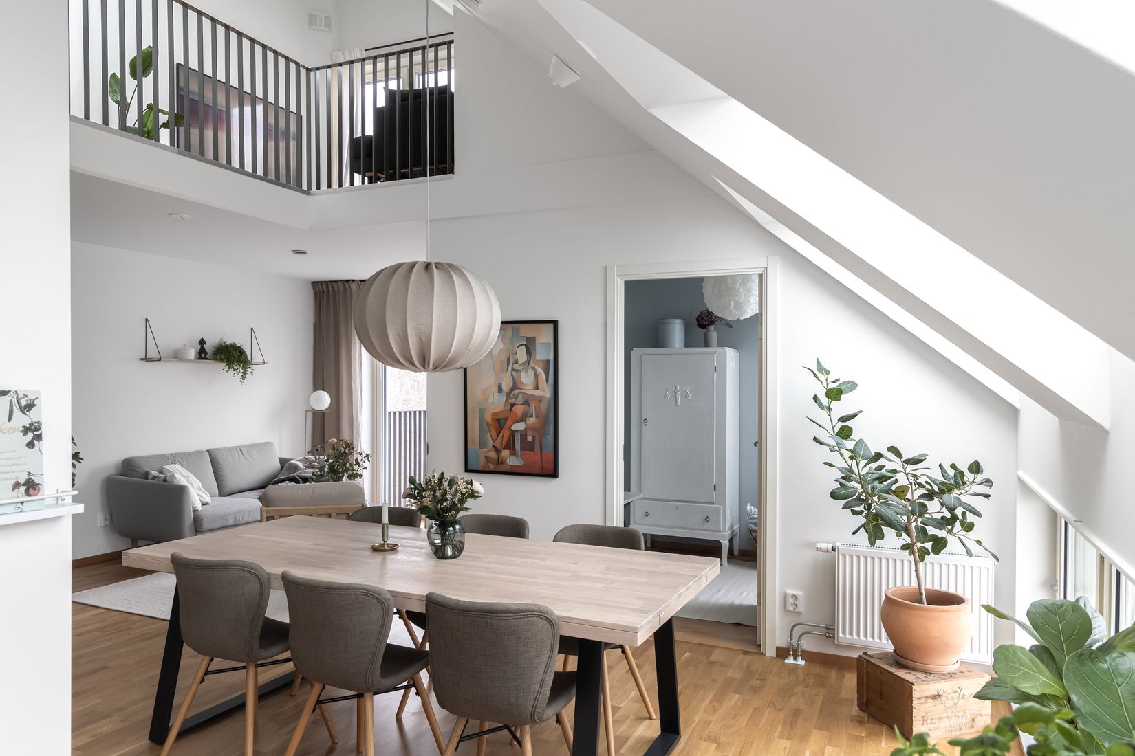 Vidare öppnar hemmet upp sig i ett härligt vardagsrum med ett generöst ljusinsläpp från takfönster och en öppen planlösning mot det eleganta köket. Här erbjuds stora sociala ytor för både vänner och familj. Från vardagsrummet nås även den fina balkongen där du kan njuta av solen, skapa en mysig loungehörna eller odla dina egna kryddor.