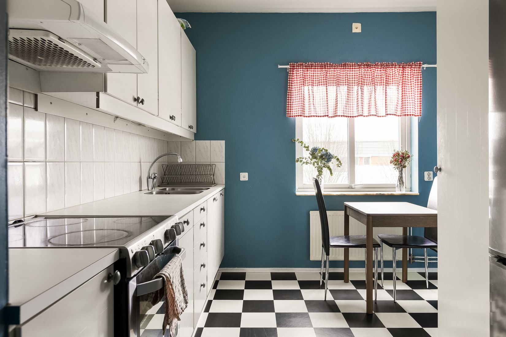 Vardagsrummet är luftigt och generöst tilltaget med ett stort fönsterparti som släpper in rikligt med dagsljus och skapar en ljus och inbjudande atmosfär. Rummet erbjuder gott om plats för både en större soffgrupp och övrigt möblemang, vilket gör det perfekt för sociala tillställningar, middagar med vänner eller avkopplande hemmakvällar. Köket är välplanerat och funktionellt med bra arbetsytor, god förvaring och en naturlig plats för matbord – en plats där både vardagens snabba måltider och helgens middagar får ta plats.