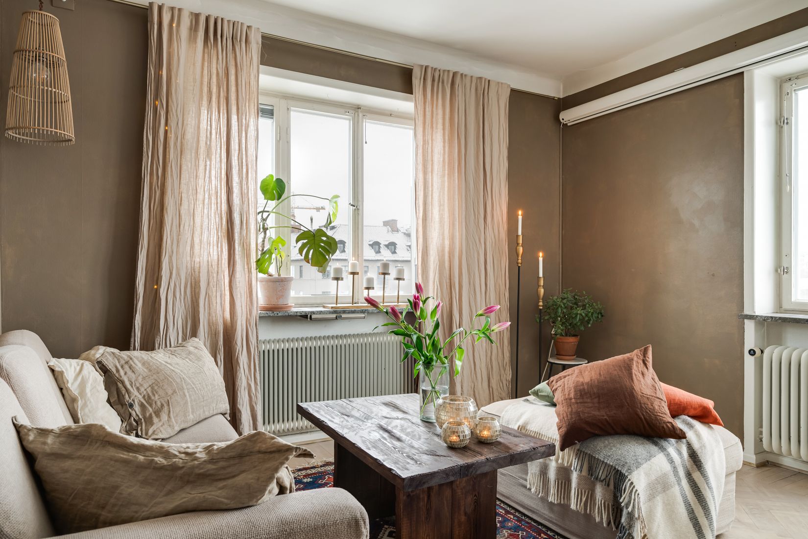 Lägenheten präglas av en varm och ombonad atmosfär med fina materialval, harmoniska färgtoner och ett härligt ljusinsläpp. Vardagsrummet är lättmöblerat och inbjudande, och sovrummet skapar en avskild och rofylld plats för vila.