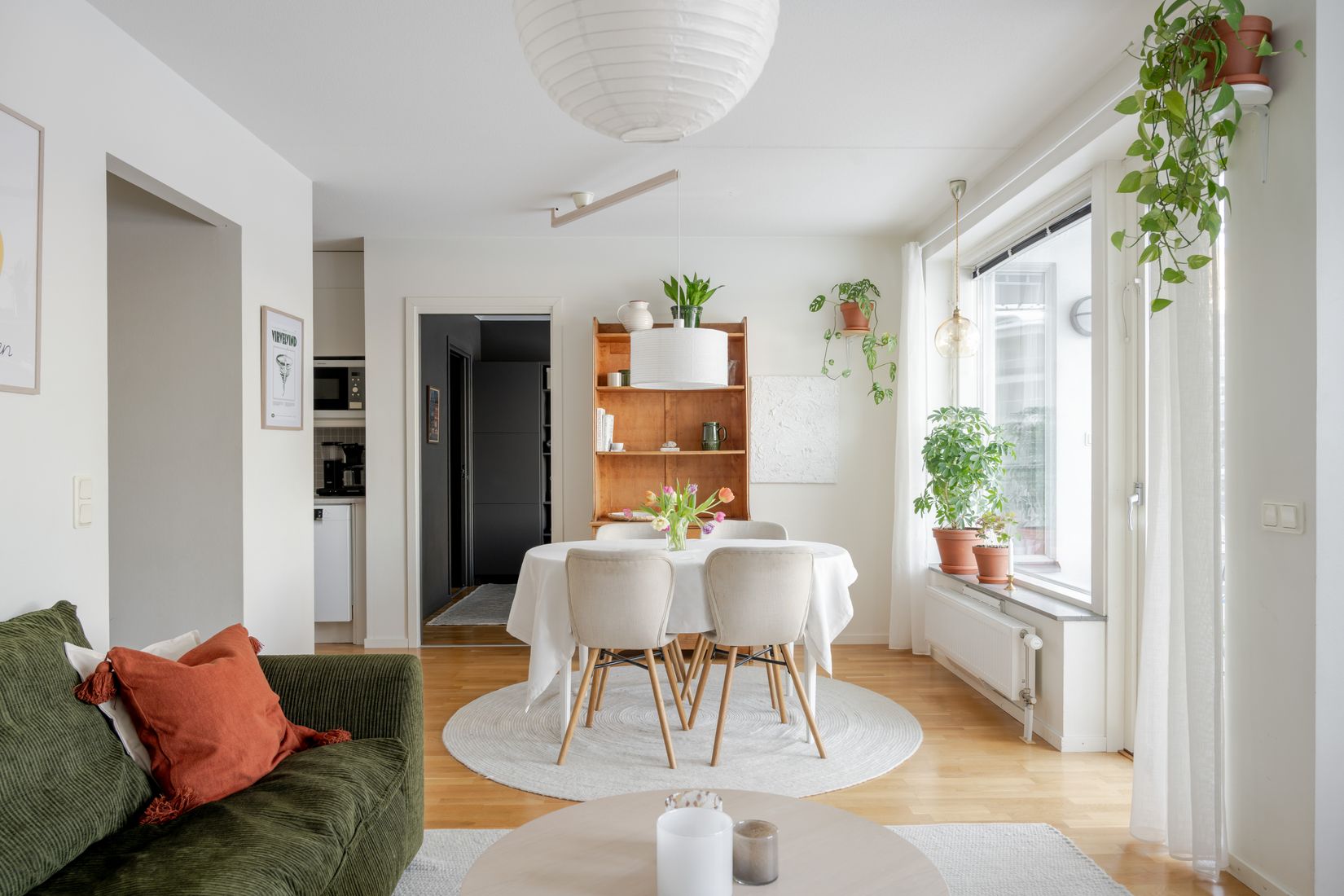 En ljus och välplanerad bostad med generöst ljusinsläpp, genomgående parkettgolv och en harmonisk färgsättning som tillsammans skapar en modern och samtidigt ombonad atmosfär.