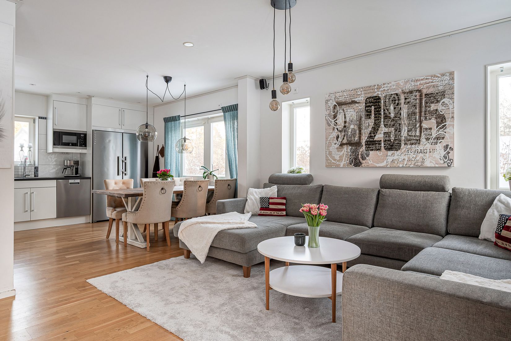 Huset erbjuder hela fem sovrum, vilket ger flexibilitet för den stora familjen, gästrummet eller hemmakontoret. De sociala ytorna är ljusa och inbjudande, med fina möjligheter att samla nära och kära för vardag och fest. Köket är funktionellt med bra arbetsytor och har naturlig kontakt med både vardagsrum och trädgård, vilket gör det enkelt att låta huset leva med årstidernas växlingar.