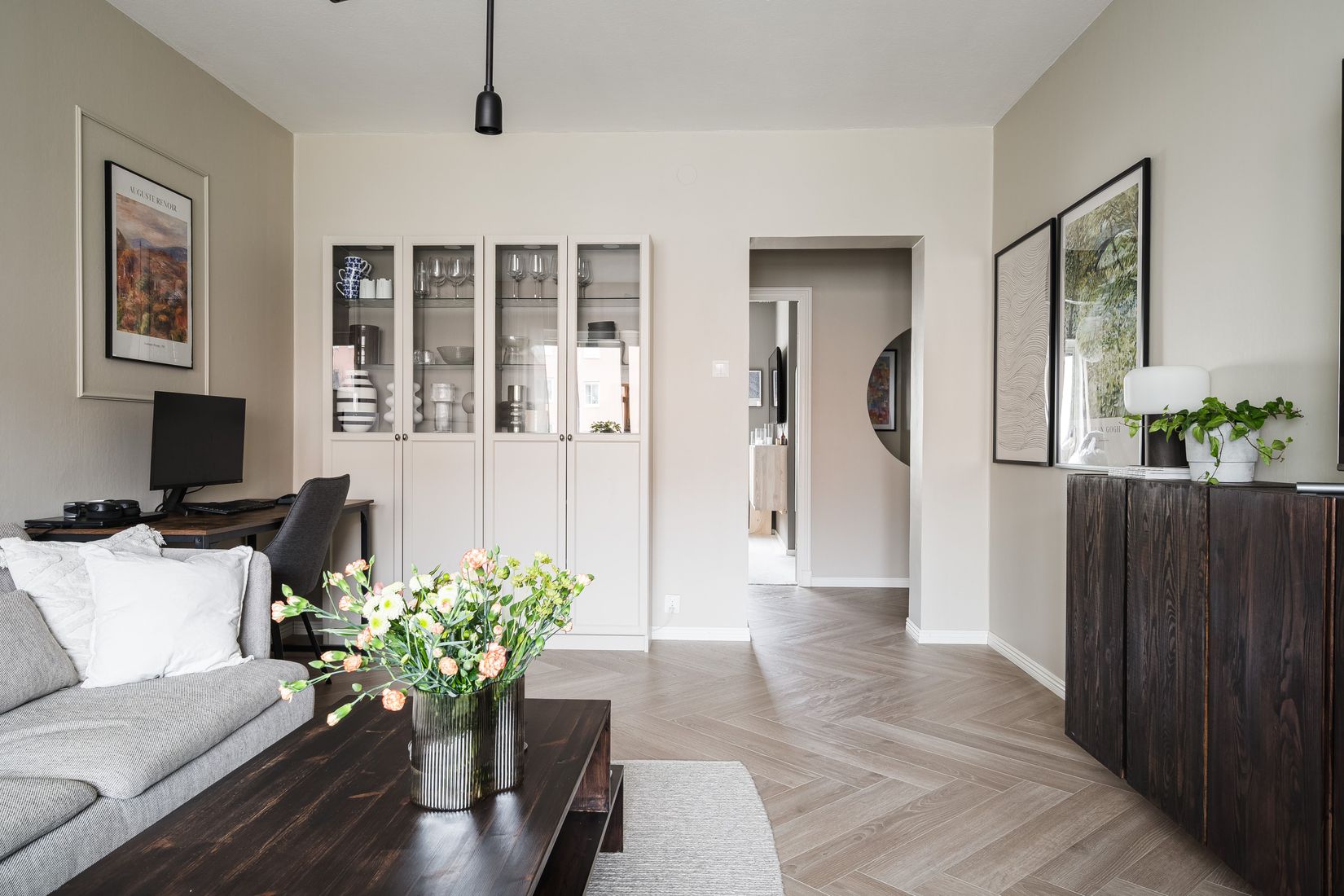 Välkommen till denna tvåa som är belägen endast en halv trapp upp. Bostaden ger dig en bra planlösning som är fördelad på ett rymligt kök med bra ljusinsläpp från ett flertal fönster. Köket har vita köksluckor, vitt kakel ovan bänskiva samt bänkskiva i laminat. Här rymmer du en matgrupp för ca 4-6 personer. Sovrum med bra förvaringsmöjligheter. Här har man öppnat upp mot klädkammaren vilket ger dig bra förvaring i sovrummet. Här rymmer du en dubbelsäng. Vardagsrummet ger dig bra möbleringsmöjligheter med plats för både en matgrupp samt en soffgrupp. Från vardagsrummet når du bostadens inglasade balkong med västerläge som vetter mot innergården.