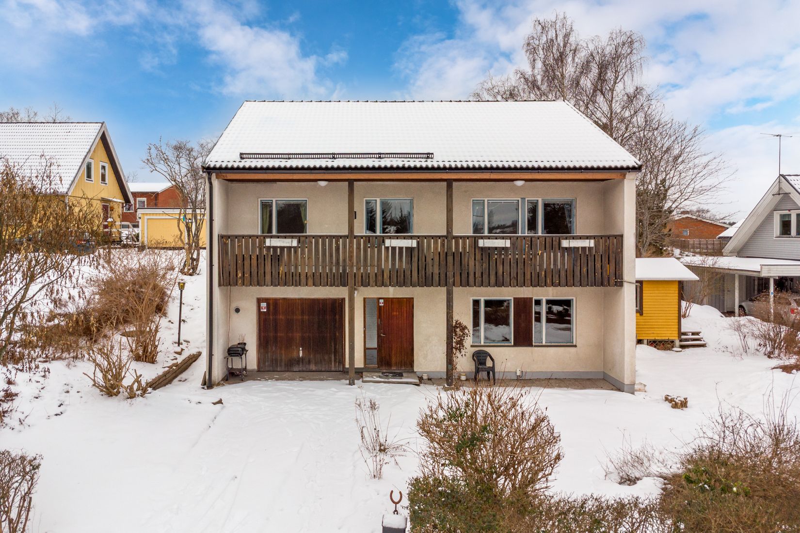 På entréplanet möts ni av en rymlig hall som leder vidare till två sovrum, ett extra rum/allrum med ljusinsläpp via betongglasfönster, duschrum i originalutförande samt en praktisk tvättstuga/pannrum. Planet lämpar sig väl för exempelvis barn- eller tonårsavdelning, hemmakontor eller gästrum. En trappa upp öppnar sig ett generöst vardagsrum med en underbar fiskbensparkett i original samt härligt ljusinsläpp tack vare stora fönsterpartier mot entrésidan. Från både vardagsrummet och den övre hallen nås en lång balkong som sträcker sig längs hela husets fasad. På övre plan finns även ett rymligt 60-talskök med matplats för 6–8 personer, ett badrum i originalutförande samt två väl tilltagna sovrum, varav det ena har utgång till trädgården på baksidan.
