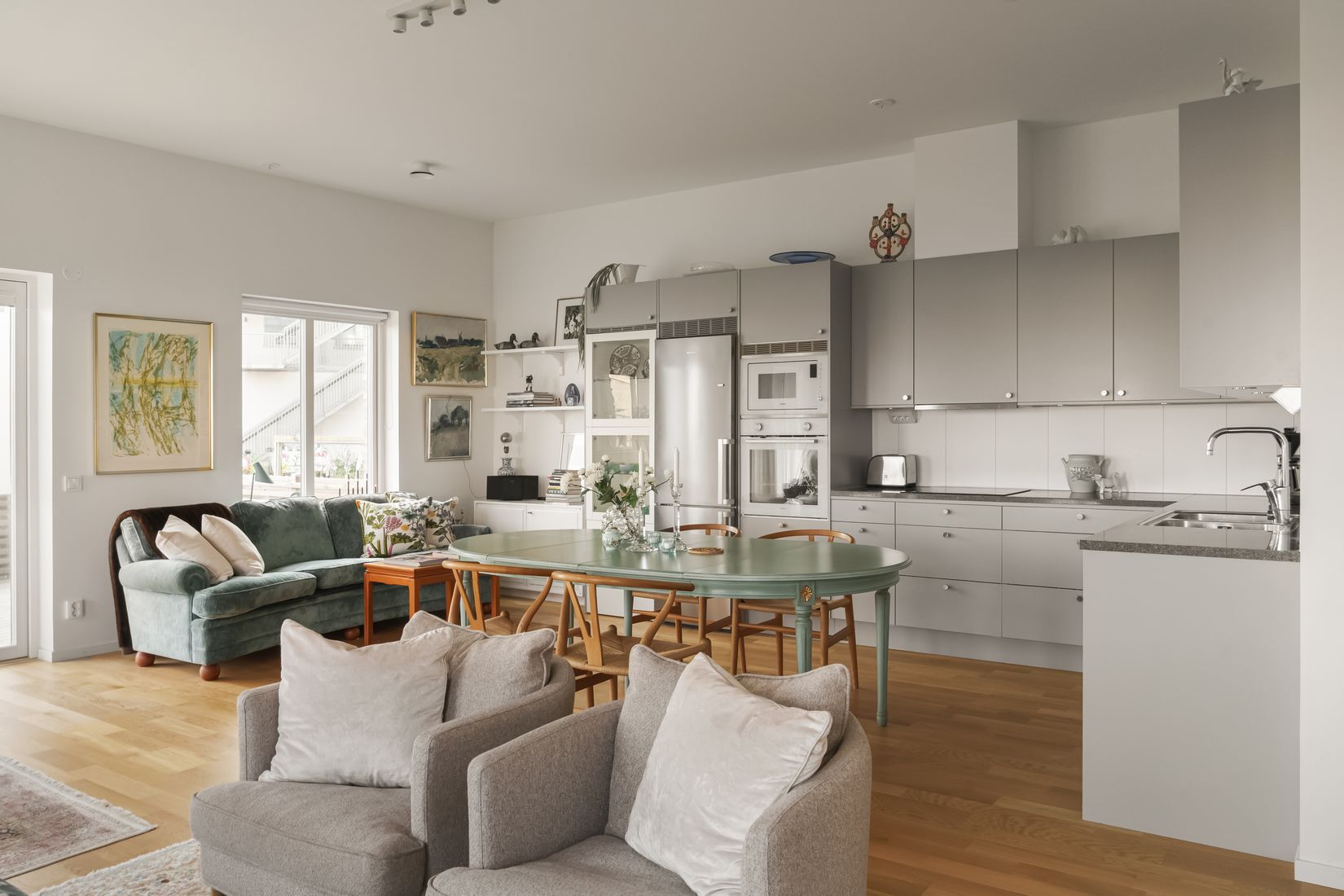 Lägenheten ligger med gavelläge i huset och präglas tack vare det av ett häroligt ljusflöde. De i övrigt noggrant utvalda materialen i form av ekparkett, kök från Vedum och vitmålade väggar gör lägenheten både tidlös och vacker! Den öppna planlösningen i kök och vardagsrum, förenad med den generösa takhöjden, är verkligen inbjudande både i vardagslivet och vid sociala tillställningar.