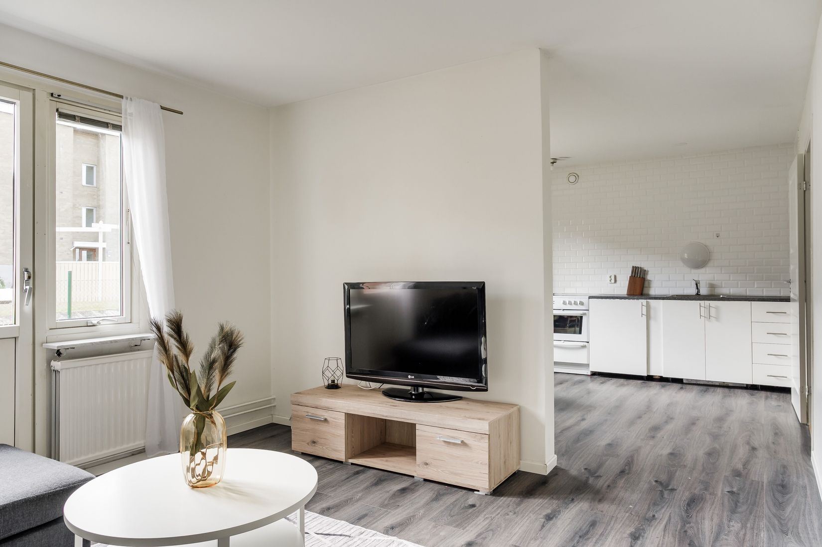 Interiören bjuder fräscha ytskikt med vitmålade väggar och tak samt nya golv i den väldisponerade planlösningen med öppenhet mellan kök och vardagsrum. Till lägenheten hör även ett stort källarförråd för extra förvaring.