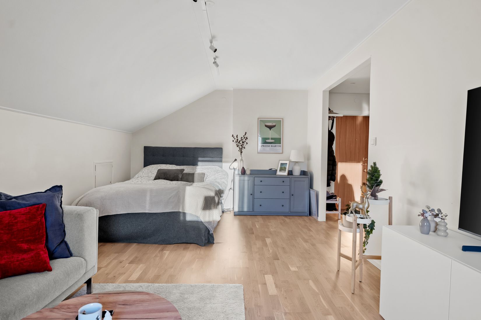 När du kliver in möts du av en välkomnande hall med god förvaring i klädkammare. Rakt fram öppnar ett fräscht och ljust kök upp sig, med plats för matbord och generösa förvaringsmöjligheter. Det rymliga allrummet erbjuder gott om plats för både soffgrupp och säng, och präglas av ett härligt ljusinsläpp från stora fönsterpartier och den franska balkongen som ger en luftig och exklusiv känsla. Helkaklat badrum med golvvärme, utrustat med wc, handfat, dusch och tvättmaskin. I hela lägenheten finns ny el samt ett modernt och smart belysningssystem.