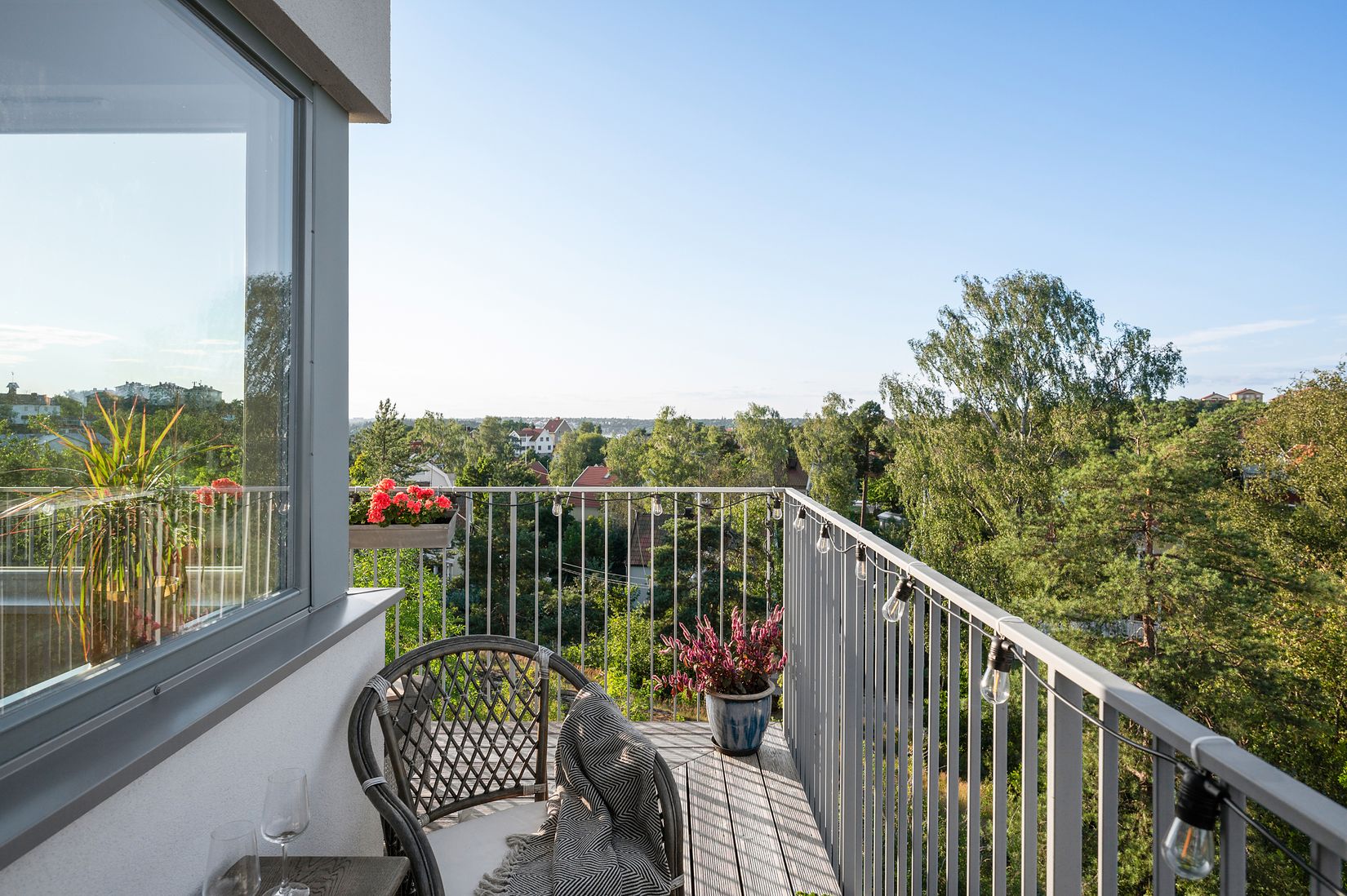 Bostaden är fördelad över två välplanerade våningsplan. Entréplanet rymmer kök och vardagsrum i en öppen och inbjudande planlösning, med en naturlig samlingsplats för både vardag och fest. För er som har behov av ytterligare ett sovrum finns möjlighet att enkelt skapa ett (se alternativ planritning). De sociala ytorna förlängs av en generös hörnbalkong med fri utsikt över takåsar och grönskande trädtoppar. Här njuter du av långa, soliga sommardagar, härliga middagar och minnesvärda stunder i gott sällskap.