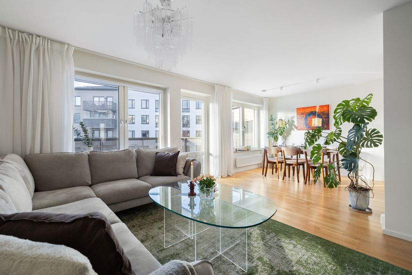 Denna välplanerade 3:a präglas av ett generöst ljusinsläpp och en härlig känsla av rymd redan innanför dörren. Den semiöppna planlösningen mellan kök och vardagsrum skapar ett luftigt och socialt hem med fina möjligheter till flexibel möblering.