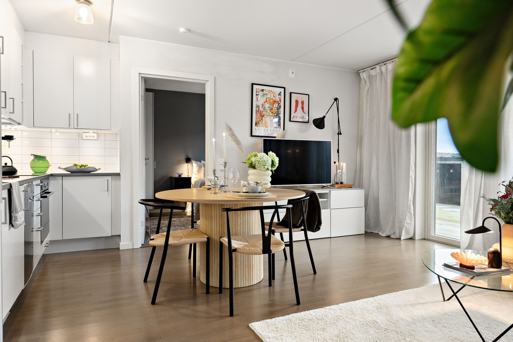 Bostaden erbjuder en smart och luftig planlösning med öppen yta mellan kök och vardagsrum, vilket skapar en härlig känsla av rymd och samhörighet. Det fullutrustade köket är försett med spishäll, ugn, inbyggd mikro och diskmaskin samt generösa förvaringsmöjligheter i djupa skåp. Här finns gott om plats för en matplats där både middagar och vardagens stunder kan avnjutas tillsammans. Den öppna och sociala planlösningen bjuder in till umgänge och gör det enkelt att socialisera med gäster medan middagen förbereds eller varför inte ta steget ut till terrassen för en grillkväll.