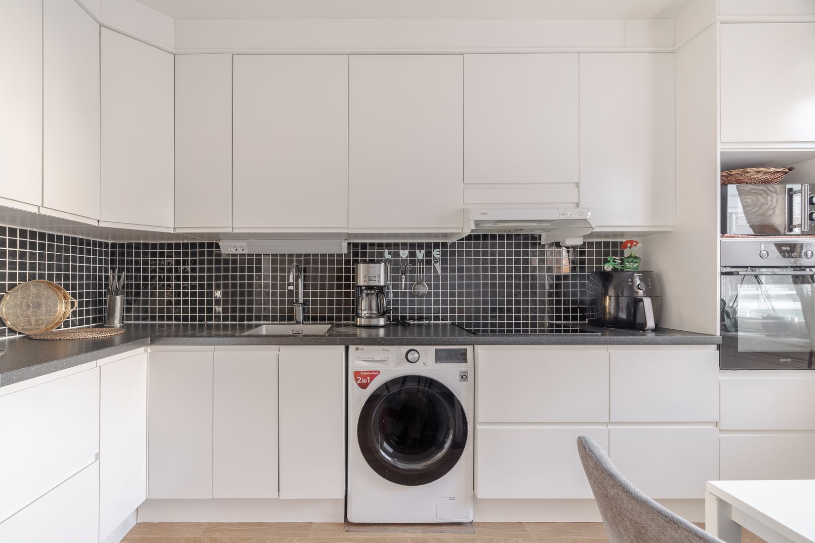Det renoverade köket är fullt utrustat med hel kyl och frys, samt spis, och har gott om både arbetsytor och förvaring i över- och underskåp. Istället för att ta plats i badrummet så har man taktiskt valt att placera tvättmaskinen i köket. Lägenheten rymmer två sovrum i bra storlek samt ett generöst vardagsrum med härligt ljusinsläpp och utgång till den inglasade balkongen.
