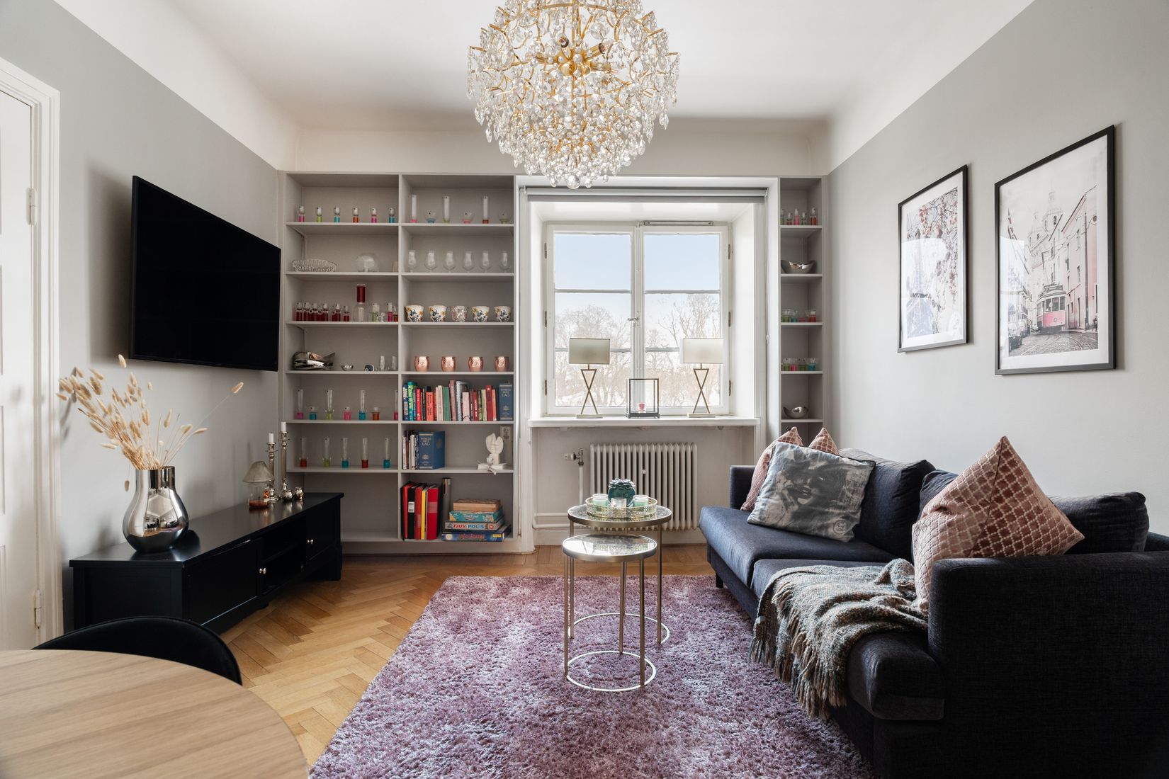 Vardagsrummet är luftigt med plats för både soffgrupp och matbord. Det smakfullt renoverade köket är yteffektivt och fullutrustat.