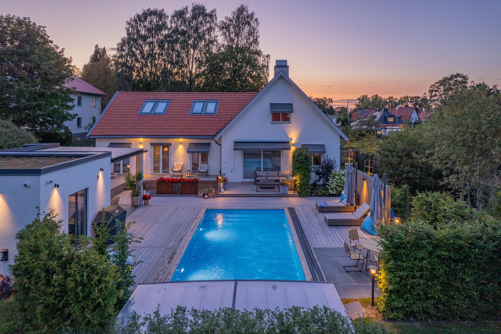 Den nyanlagda trädgårdstomten är en grön oas med hög nivå på design och stor omsorg om detaljer. Här finns gott om plats för umgänge, lek och avkoppling – inte minst tack vare det exklusiva poolhuset med tillhörande pool. En perfekt plats för sommarens middagar, kvällsdopp och minnesvärda stunder med familj och vänner.