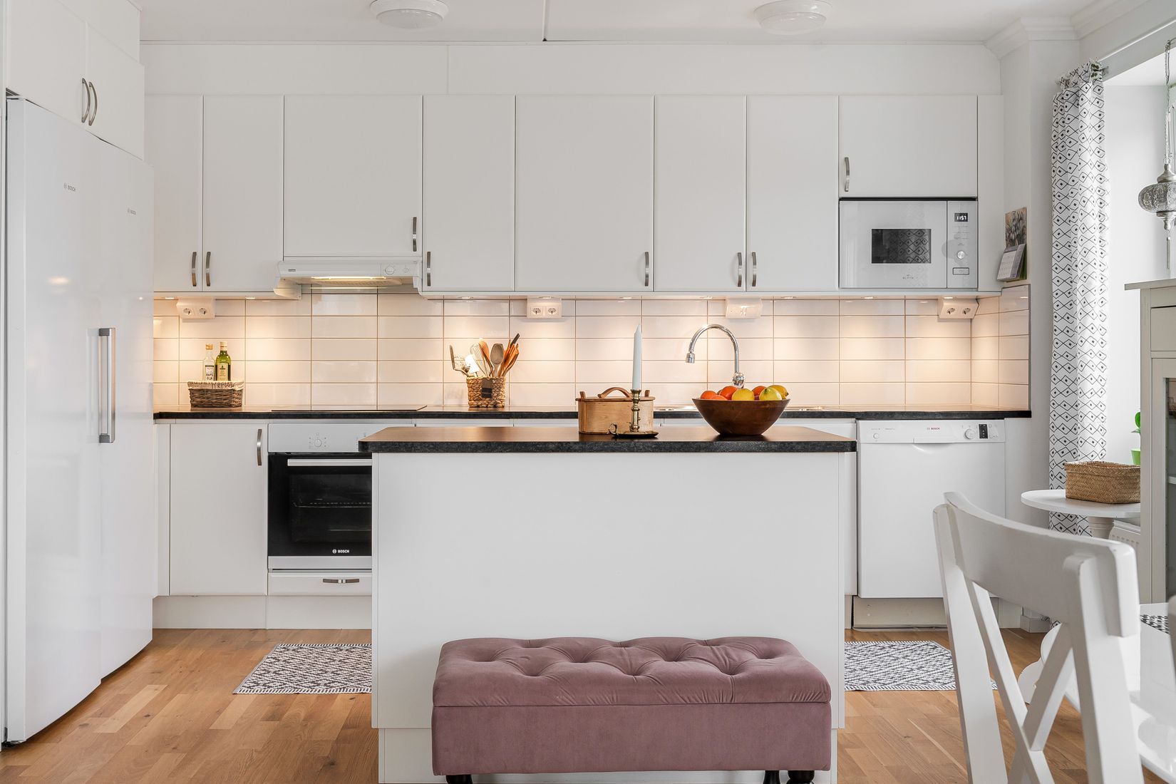 Redan vid ankomst märks det genomtänkta boendet. Du parkerar bekvämt i garaget i källarplan och tar hissen hela vägen upp till lägenheten. Väl innanför dörren möts du av en rymlig hall med parkettgolv, två garderober samt en praktisk klädkammare – här finns gott om plats för ytterkläder, skor och förvaring som förenklar vardagen. Kök och vardagsrum ligger i öppen och luftig planlösning med fönster i två väderstreck som ger ett fint ljusinsläpp. Köket är modernt och stilrent med vita släta skåpsluckor, köksö och full maskinell utrustning med kyl och frys i fullhöjd, inbyggd ugn och mikro, induktionshäll, fläkt samt diskmaskin. Här finns gott om arbetsytor och plats för både matbord och en bekväm soffgrupp. Från vardagsrummet når du den inglasade balkongen i österläge – en skyddad plats att njuta av morgonkaffet stora delar av året. Lägenheten erbjuder tre välplanerade sovrum samlade i en lugn del av bostaden, samtliga med parkettgolv och fint ljus. Master bedroom har egen klädkammare och utsikt mot föreningens trevliga innergård – ett rofyllt läge för vila och återhämtning. Det helkaklade duschrummet är modernt och funktionellt med klinkergolv och behaglig golvvärme, dusch med vikbara glasväggar, wc, tvättställ, handdukstork samt både tvättmaskin och torktumlare – allt för att underlätta vardagen. Därutöver finns även en stilren gästtoalett.