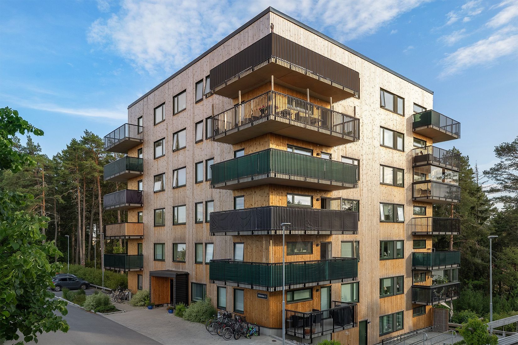 Redan i hallen märks den höga standarden och de genomtänkta lösningarna av. Ljust målade väggar tillsammans med en ljus ekparkett från Kährs som går enhetligt i hela lägenheten. Här finns mycket gott om förvaringsmöjligheter i klädkammare, och en helväggsgarderob bakom skjutdörrar. Ovanligt för nyproduktion är att det även finns källarförråd. Hallen är möblerbar och här ligger enhetligt de tre sovrummen bredvid varandra, med badrum och WC på motsatt sida, för att sedan göra plats åt en trevlig social yta med vardagsrum och kök i öppen planlösning och utgång till balkongen. Balkongen är en kungsbalkong, som går runt gaveln och blir på så sätt mycket rymlig och med flera möbleringsmöjligheter. Utsikt mot närliggande skogsparti. Köket från Vedum har fått flera tillval för maskinparken, köksluckor mm, och har en exklusiv stil. Här finns även gott om arbetsyta och bra förvaring i flera skåp. Matplats för 6-8 personer eller kanske mer vid större sammankomster. Vardagsrummet rymmer enkelt en soffhörna och övriga möbler. Badrummet har en rymlig duschdel bakom vikbara dörrar i glas, och en praktisk tvättdel med torktumlare, tvättmaskin, arbetsbänk och skåp. Även i badrummet har flera tillval gjorts. Tre sovrum som är enkla att möblera. I två av sovrummen står två garderober vardera, och i master bedroom finns en inbyggd garderob, samt en dubbelgarderob.