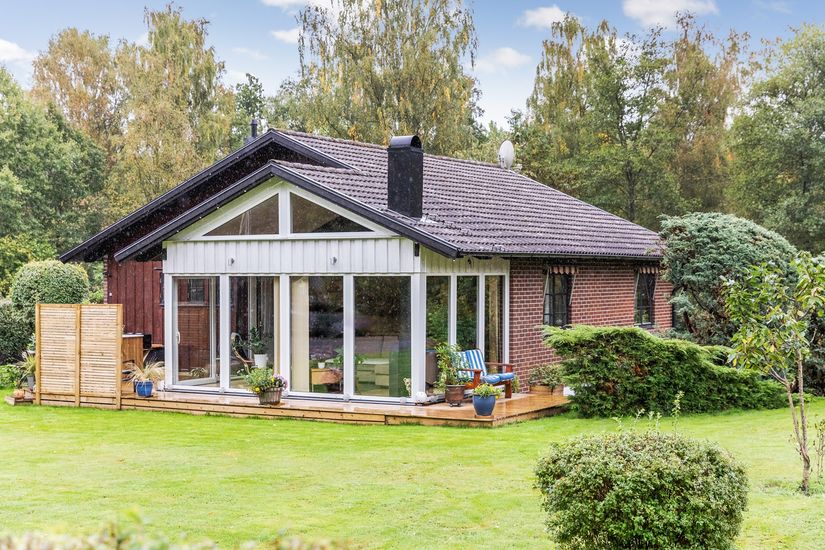 Entréplanet präglas av ett luftigt och inbjudande vardagsrum med takhöjd upp i nock, vilket skapar en härlig rymd och ett fint ljusinsläpp. Här finns gott om plats för både umgänge och avkoppling. Det stora köket erbjuder bra arbetsytor och förvaring samt plats för matbord. Från huset nås även ett inglasat uterum med kamin. En härlig och uppskattad yta som förlänger säsongen och blir en naturlig samlingspunkt större delen av året.