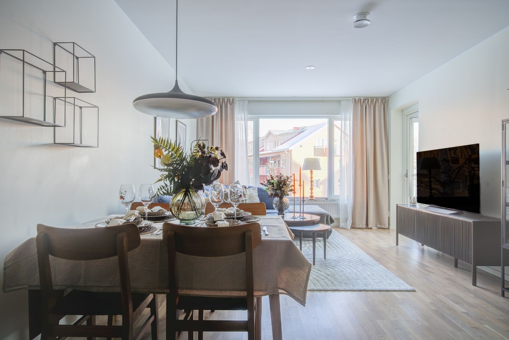 Kök och vardagsrum utgör bostadens naturliga hjärta och präglas av ett generöst ljusinsläpp från stora fönsterpartier som skapar en luftig och trivsam känsla. Vardagsrummet rymmer både soffgrupp och matplats, vilket gör det till en perfekt samlingspunkt för middagar och sociala tillställningar. Köket är modernt och fullt utrustat med mörka köksluckor från Creoform, bänkskiva i sten samt vitvaror såsom induktionshäll, ugn, inbyggd mikro, diskmaskin, köksfläkt samt även en kombinerad kyl/frys.