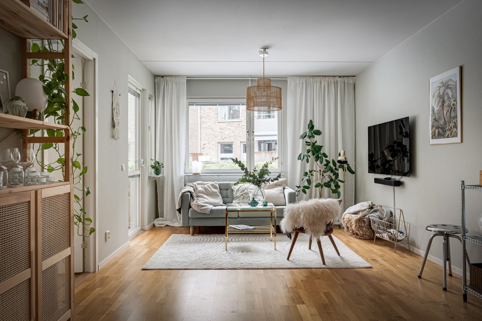 De väl utnyttjade kvadratmetrarna disponeras över ett rymligt kök som totalrenoverats med genomtänkta materialval, ett ljust och lättmöblerat vardagsrum, ett rogivande sovrum med goda förvaringsmöjligheter samt ett helkaklat badrum utrustat med golvvärme, tvättmaskin och torktumlare.