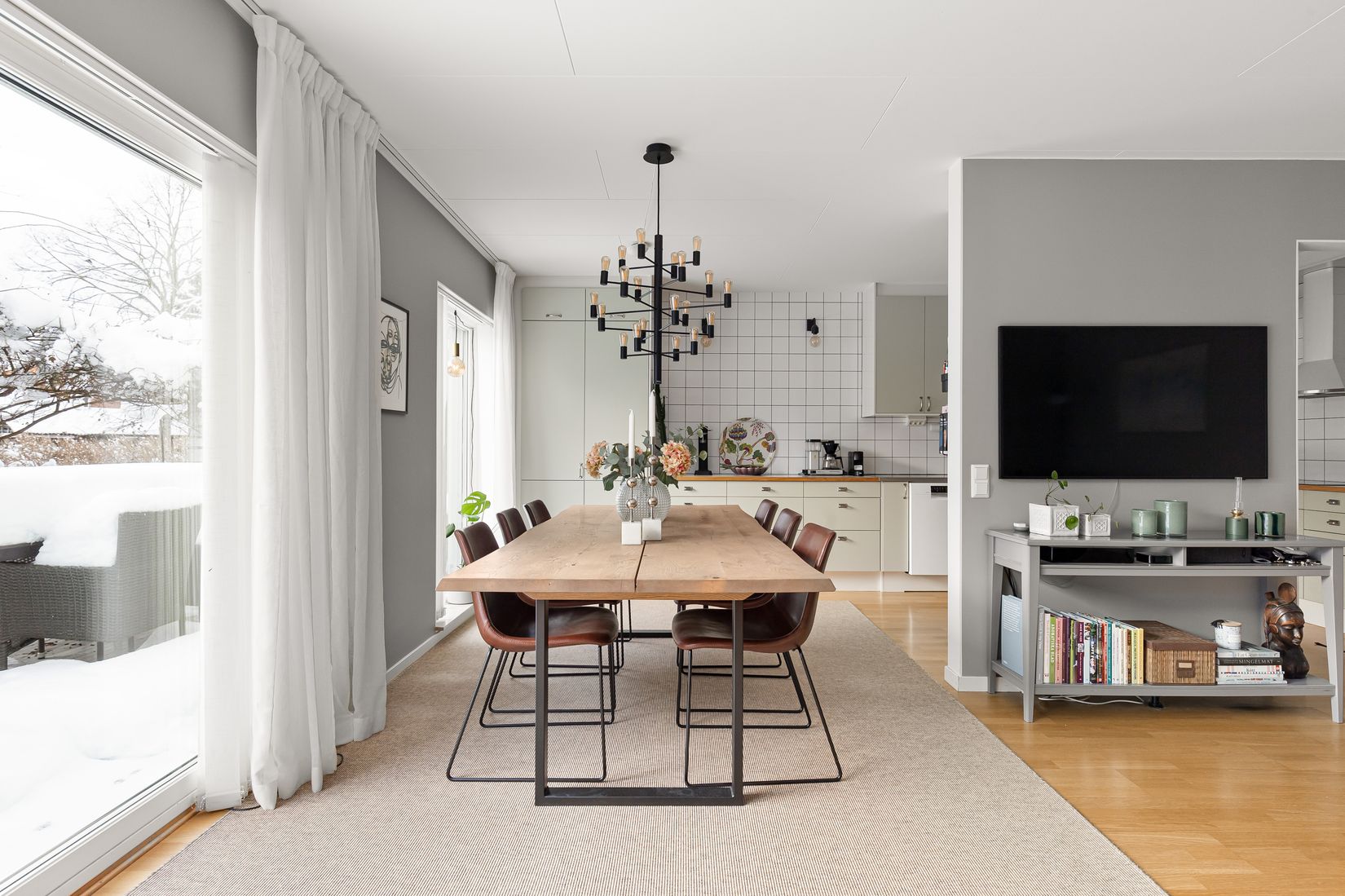 På entréplanet möts du av en rymlig hall med generösa förvaringsmöjligheter. Här finns även ett helkaklat badrum med dusch, tvättmaskin och torktumlare. Vidare in öppnar hemmet upp sig i en luftig och social planlösning där vardagsrum och kök samspelar på ett naturligt sätt. Köket är välutrustat med gott om förvaring och generösa arbetsytor, och den stora matplatsen rymmer både vardagsmiddagar och större bjudningar. Från vardagsrummet leder ett stort fönsterparti med skjutdörr ut till den utbyggda altanen i soligt söderläge, vilket skapar en härlig förlängning av sällskapsytorna under årets varmare månader.