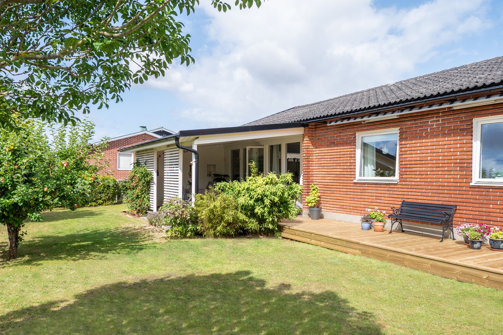 Här bjuds du på en luftig, social planlösning, ett generöst ljusinsläpp och rum som flyter in i varandra på ett varmt och välkomnande sätt. Stora fönsterpartier ramar in utsikten mot den lugna omgivningen och det finns gott om plats för att förena inne- och utemiljön på ett enkelt sätt.