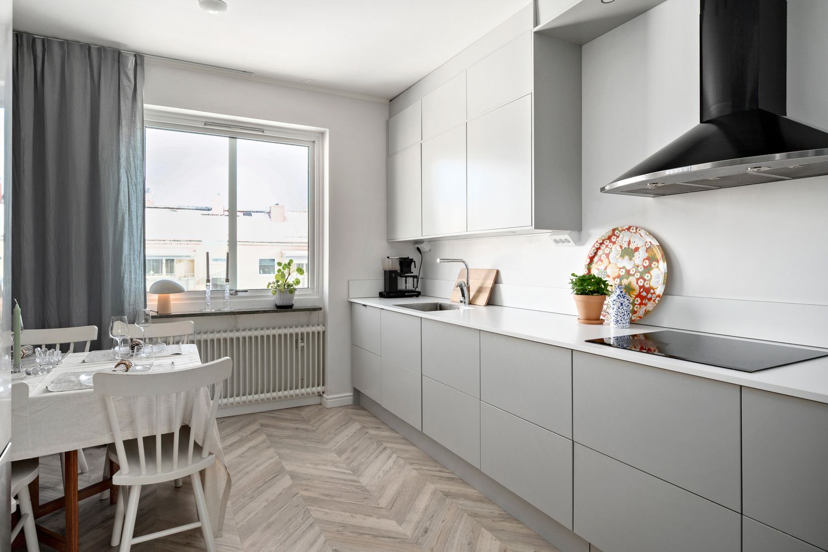 Köket är smakfullt renoverat med ljusgrå, beslagfria luckor och erbjuder gott om både förvaring och arbetsyta. Den maskinella utrustningen är komplett och vid fönstret finns plats för matbord för fyra personer vilket blir en naturlig samlingspunkt för både vardag och middagar.