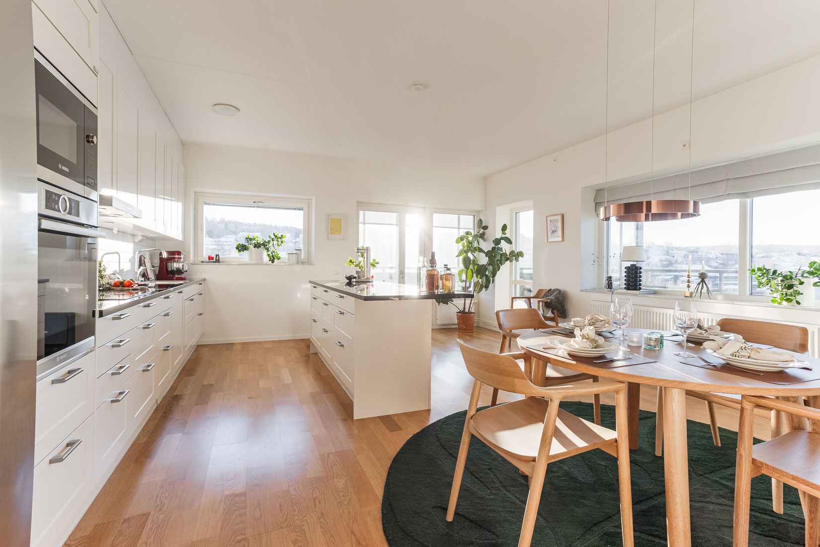 Öppen planlösning mellan kök och vardagsrum ramas in av stora fönsterpartier som släpper in rikligt med ljus och öppnar upp mot en vidsträckt panoramavy över Stenstan och Norra berget.