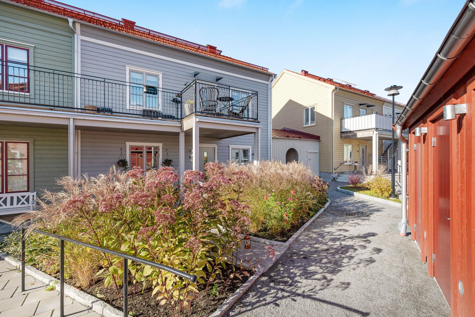 Uteplatsen i österläge blir en naturlig förlängning av bostaden under årets varmare månader, med plats för möbler och växter i en lugn och trivsam miljö.