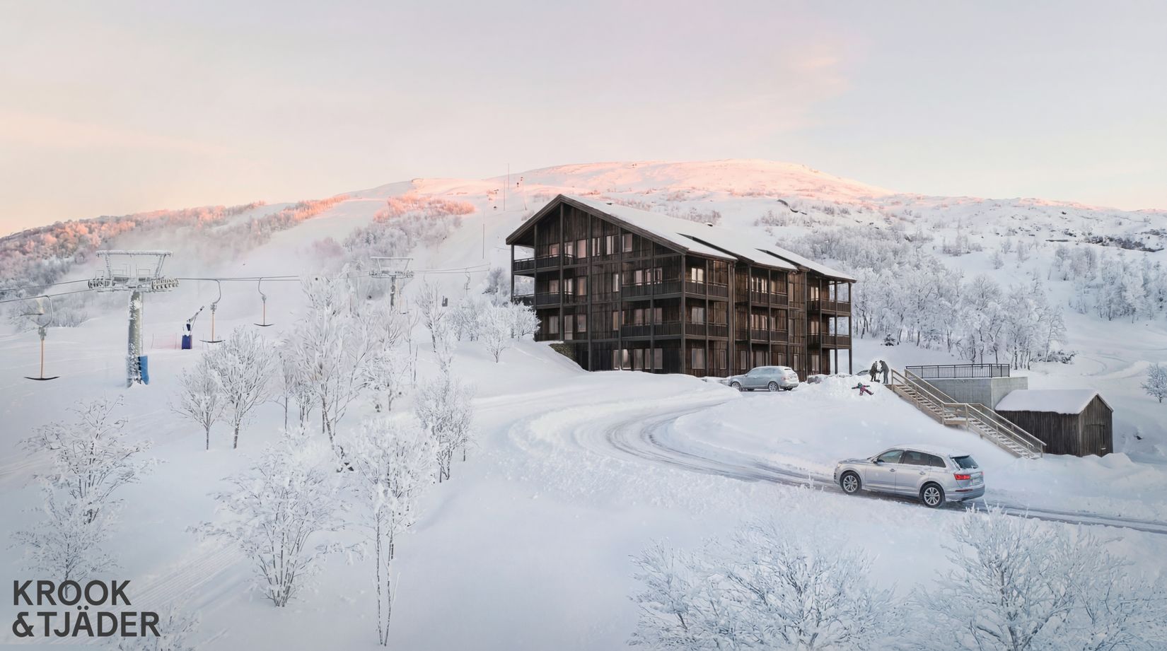 Inspirerat av Härjedalens arkitektur - I Vigelby View möter gedigna material smarta funktioner som underlättar. Välkommen in till rejäla trägolv, stora glaspartier som ramar in den storslagna naturen och långa balkonger längs den svarttjärade fasaden. Byggnaden är anpassad efter marknivåerna och tonas ned av de brutna taket. Här ryms 14 lägenheter i 4 olika storlekar från mysiga studiolägenheter på 32 kvm till maffiga penthouse på hela 113 kvm. Gemensamt för alla lägenheter är öppen planlösning i sällskapsytorna med sammanhängande kök och vardagsrum samt vilsamma sovrum och badrum med bastu, vilket ger ett fjällhem för både umgänge och avkoppling. En annan fördel är att nästan alla lägenheter är hörnlägenheter med utsikt åt två väderstreck. I entréplanet finns förråd till varje lägenhet, möjlighet att torka och tvätta utrustning samt plats till förvaring av skidutrustning och cykel. Helt enkelt ett boende utformat för att underlätta livet på fjället.