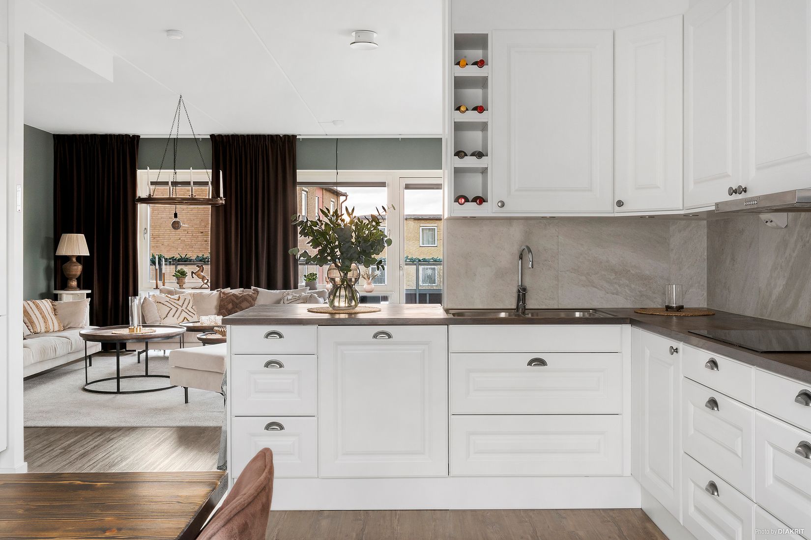 Vardagsrummet har en generöst tilltagen yta, utgång till balkong i västerläge och ligger i öppen planlösning med köket. För den som har behovet av fler sovrum, kan vardagsrummet med enkelhet delas av. Det ljusa köket från JKE går i lantlig stil med mörka bänkskivor och ljusgrått kökskakel. Här finns dessutom gott om plats för ett större matbord. Innanför köket hittar vi lägenhetens andra sovrum.