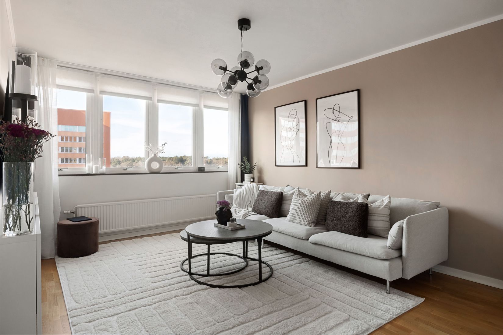 Bostaden erbjuder ett luftigt vardagsrum med generösa fönsterpartier som släpper in rikligt med dagsljus och skapar en inbjudande atmosfär. Här finns gott om plats för både soffgrupp och matplats. Det stilrena köket är i mycket gott skick med bra arbetsytor, förvaring samt plats för matplats. Perfekt för både vardagsmatlagning och sociala middagar.