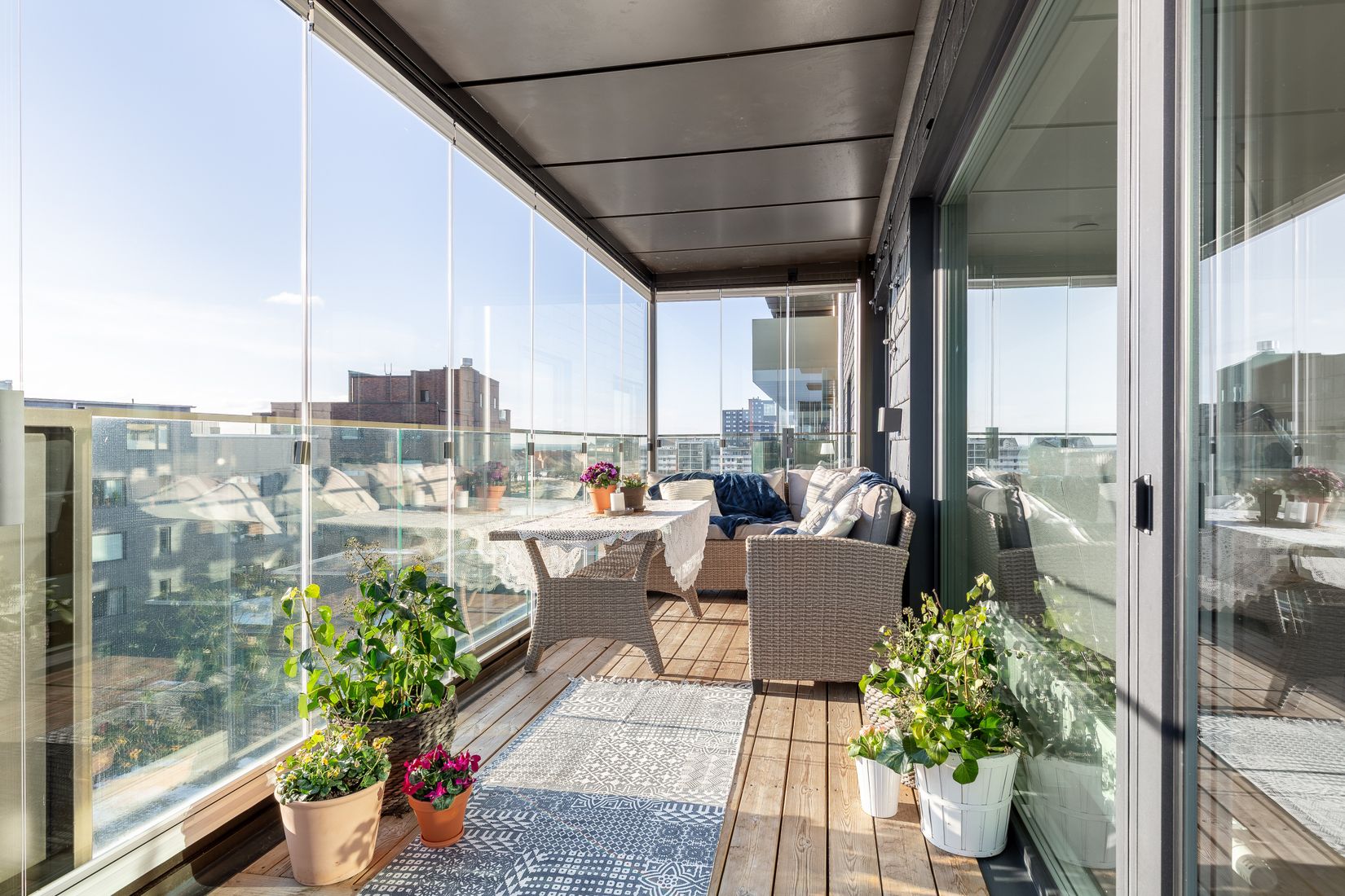 Lägenheten erbjuder en enorm balkongyta, så stor att den kunnat delas av till en öppen del, vilken är lämplig för grillning och solning, samt en stor inglasad del som fungerar som ett extrarum större delen av året. Interiören präglas av ljusa ekparkettgolv, generösa fönsterpartier som släpper in rikligt med dagsljus samt moderna ytskikt som bidrar till en trivsam atmosfär.