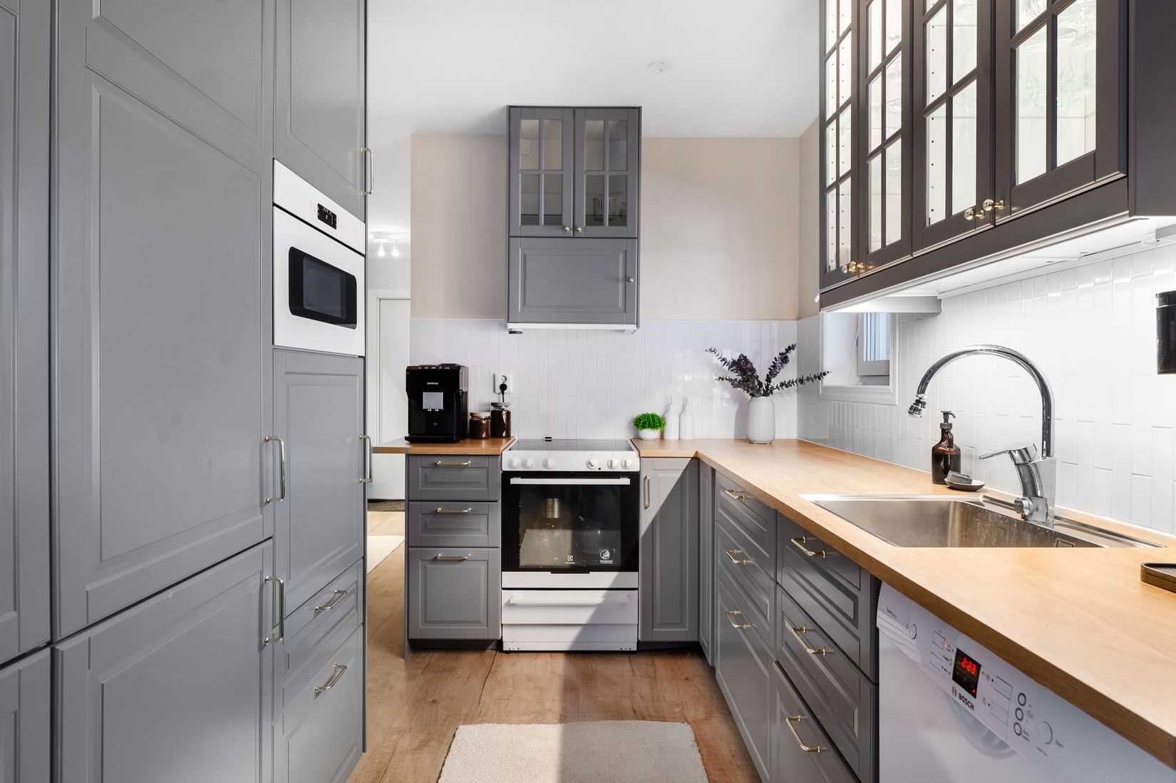 Redan i den välkomnande och rymliga hallen infinner sig en luftig känsla med gott om plats för avhängning. Vidare öppnar bostaden upp sig mot det stilrena, grå köket som är fullt utrustat och utformat för att fungera lika bra i vardagen som vid sociala tillställningar. Intill köket finns en naturlig matplats i öppen planlösning mot vardagsrummet, vilket skapar ett härligt flöde och en inbjudande atmosfär. Vardagsrummet är generöst tilltaget med plats för både soffgrupp och matbord – en perfekt yta för umgänge och avkoppling. Sovrummet är rofyllt och bjuder på fint ljusinsläpp samt goda förvaringsmöjligheter i garderober med skjutdörrar som smälter diskret in i rummet.